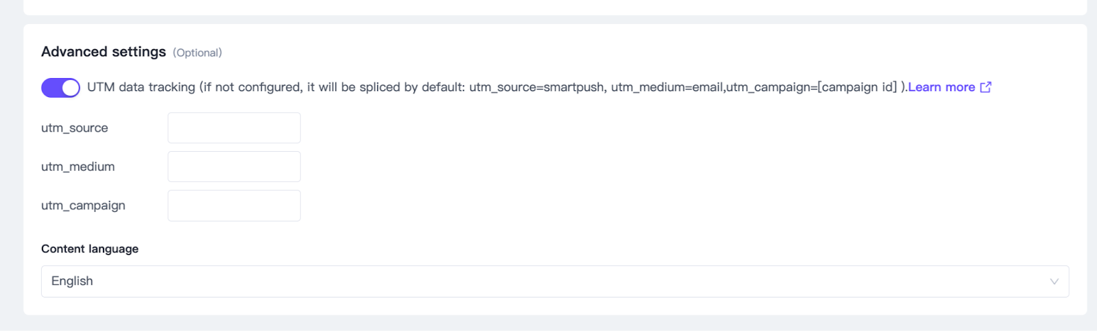 Email Campaigns: Go to the Advanced settings section and enable UTM data tracking. You can set up UTM parameters in the following fields:
