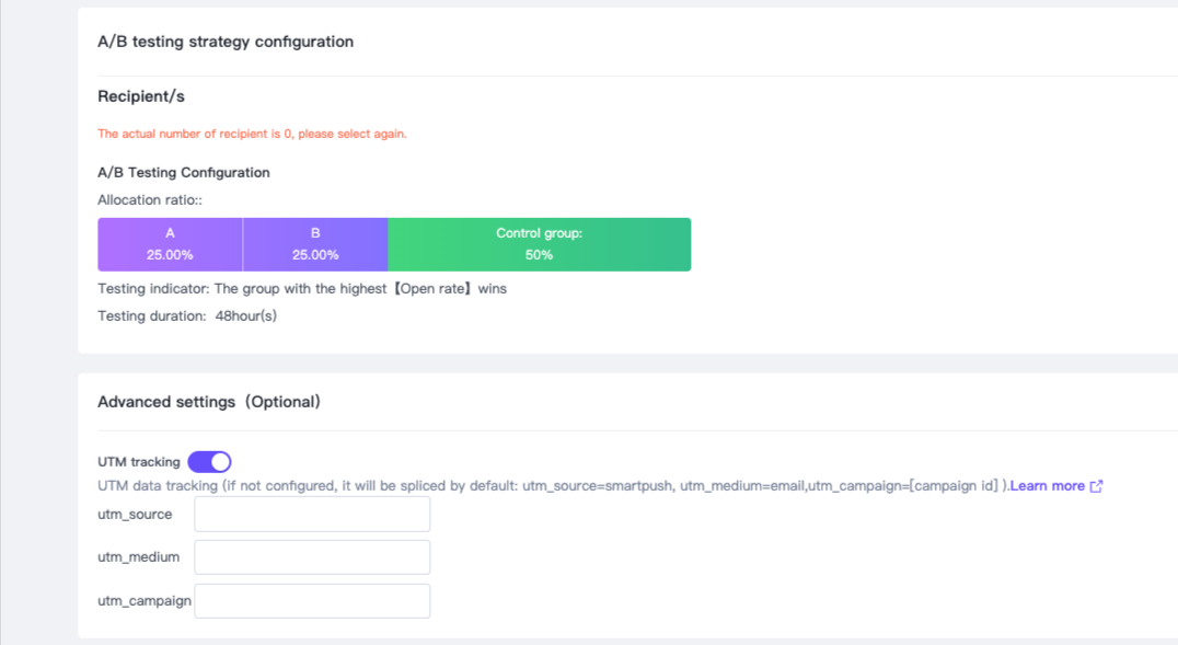 - After finishing setting both of the A/B Testing campaigns, go to the Advanced settings section and enable UTM data tracking. You can set up UTM parameters in the following fields: