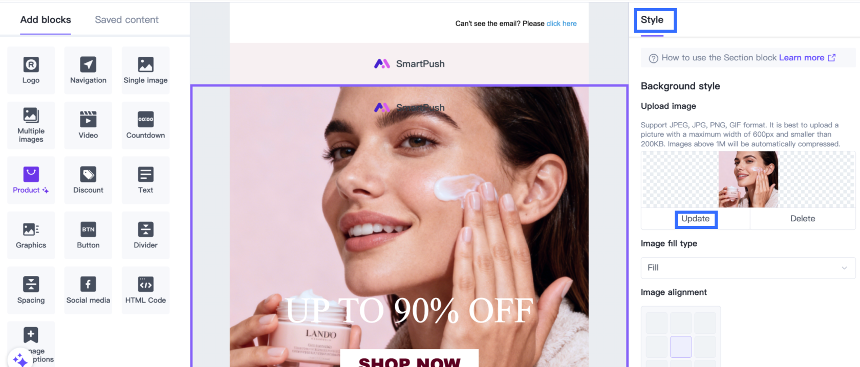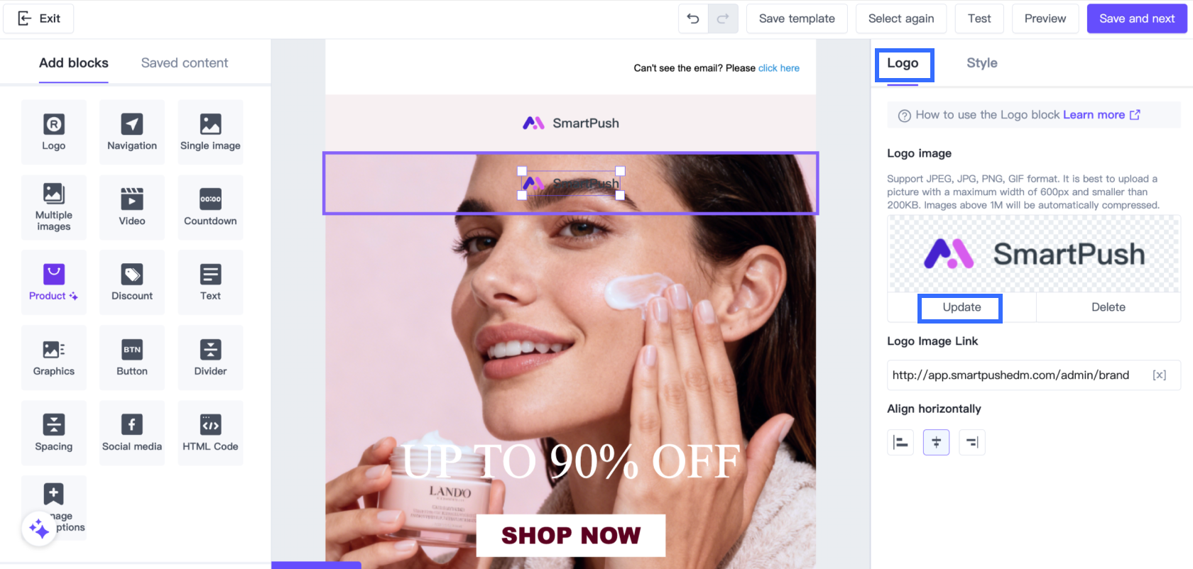 The Logo Block allows you to display your brand logo in marketing emails. It is typically placed at the top of an email, helping recipients quickly recognize and remember your brand.