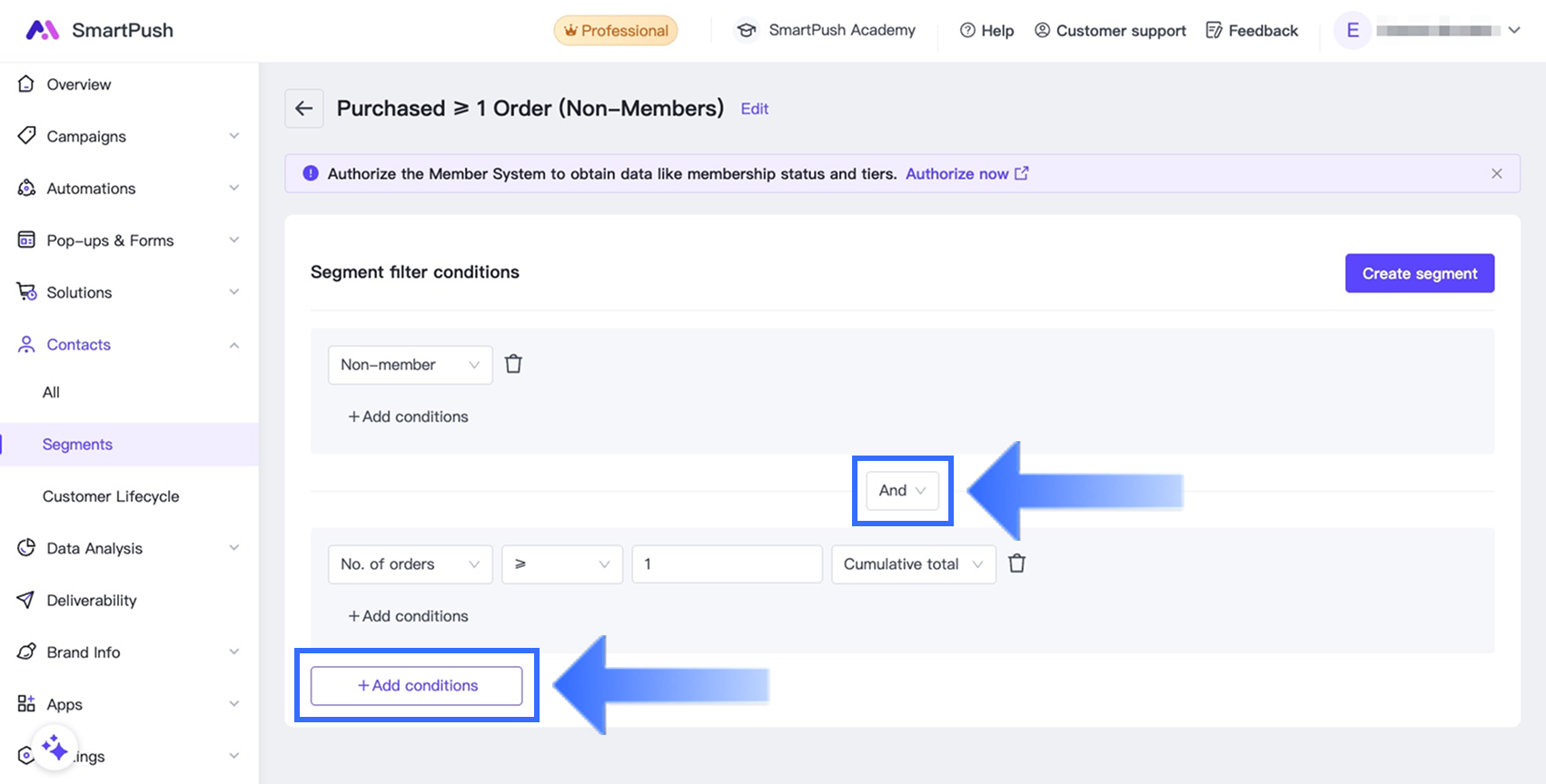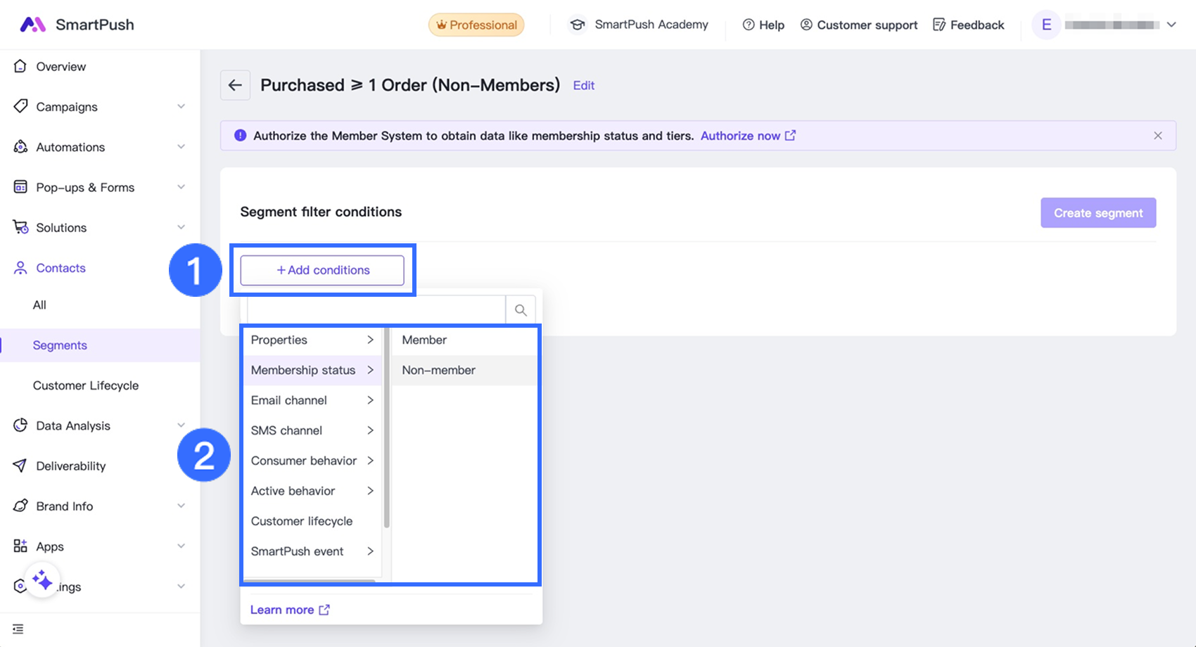 In the Segment filter conditions section, click + Add conditions, then select a filter type (e.g., Properties, Membership status, Email channel) in the condition panel and configure your conditions.