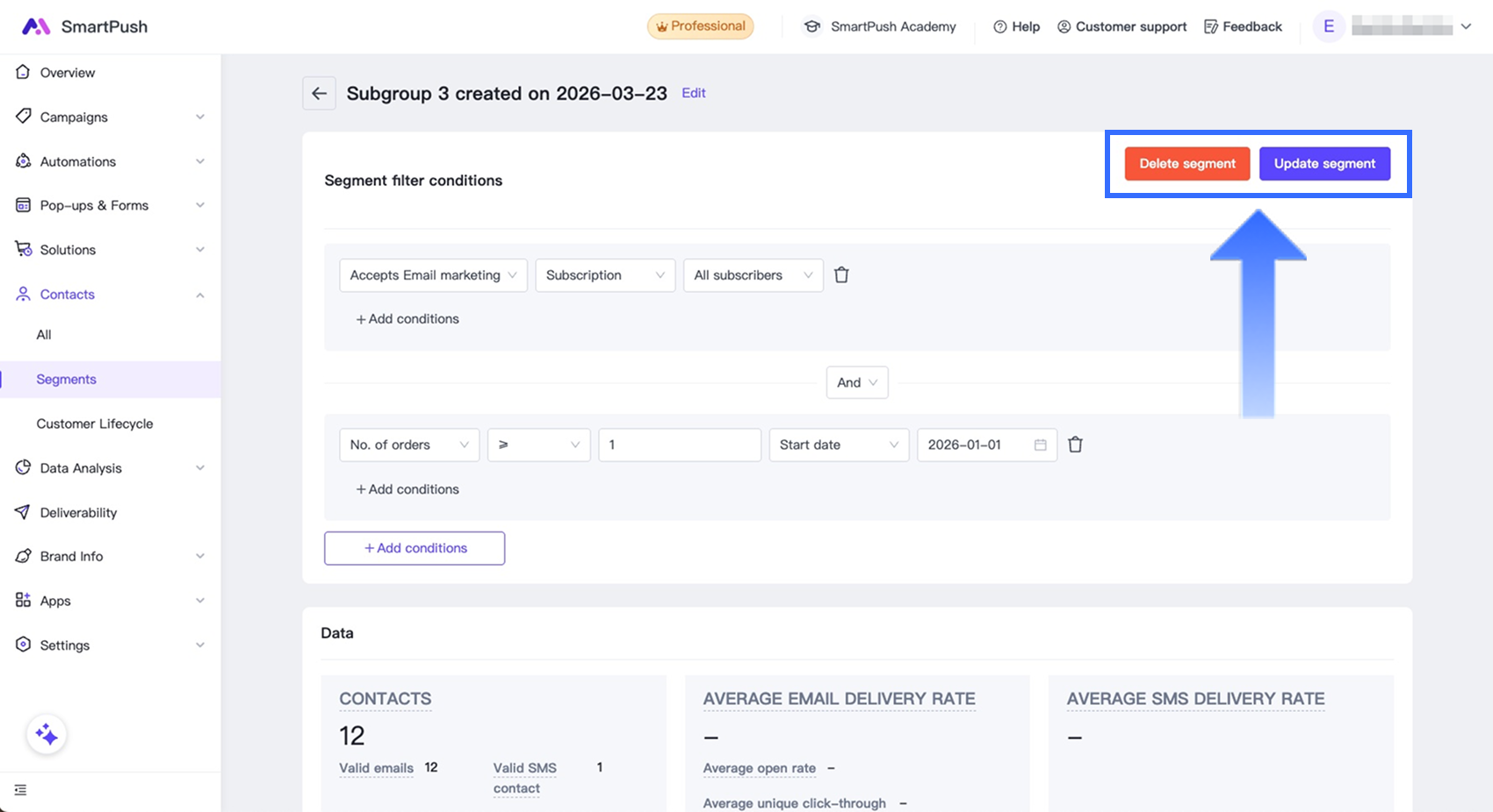 After creation, you can view contact data and performance metrics at the bottom of the page and manage the segment accordingly:
