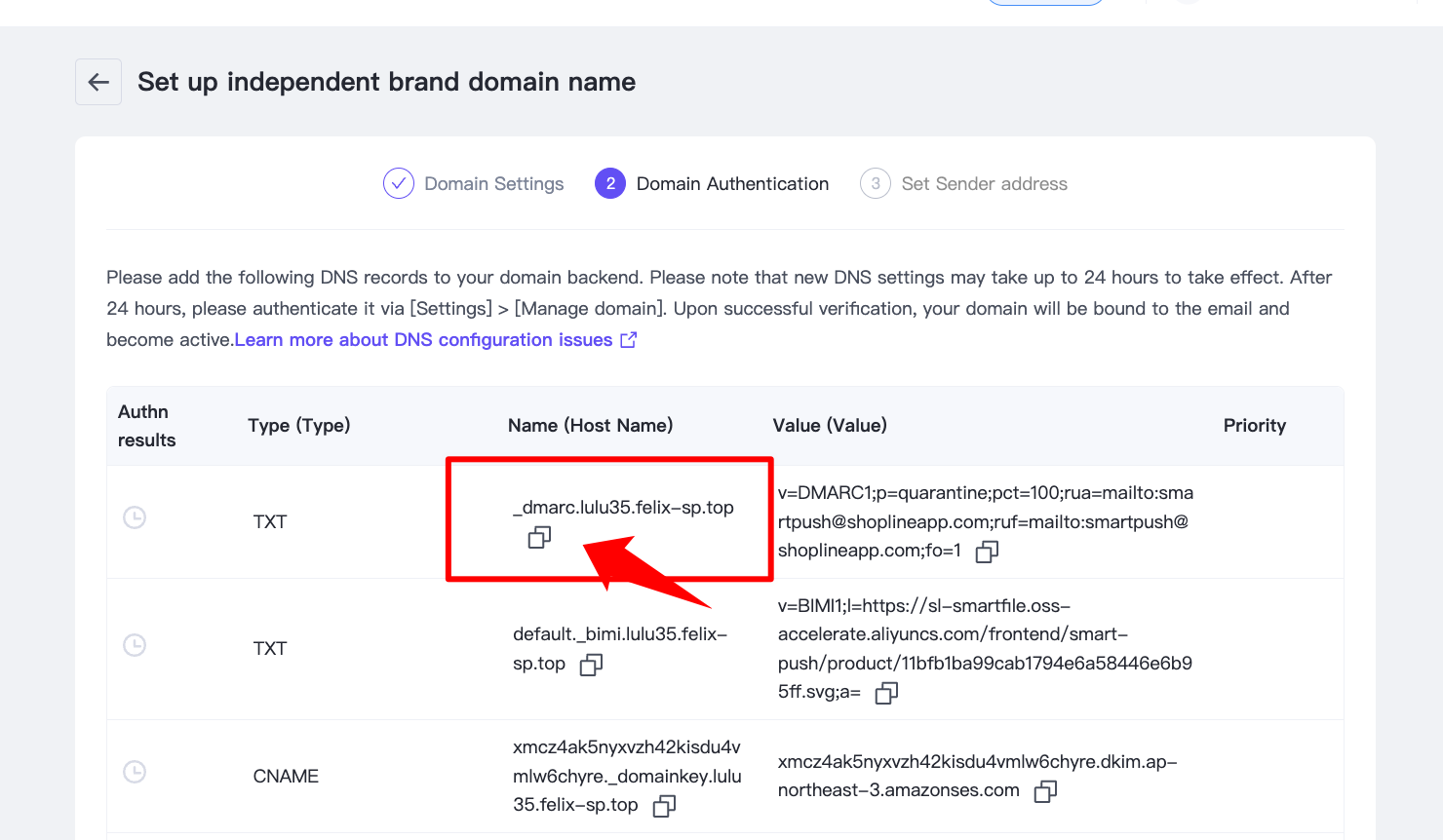 SmartPush operates the DNS records independently. Therefore, even if you have set up DNS records in SHOPLINE or Shopify, you must set them up separately in SmartPush.
