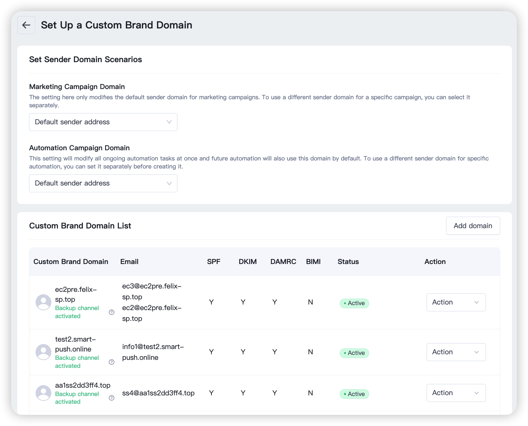 You can view and manage all the authenticated domains on the "Domain Management" page.