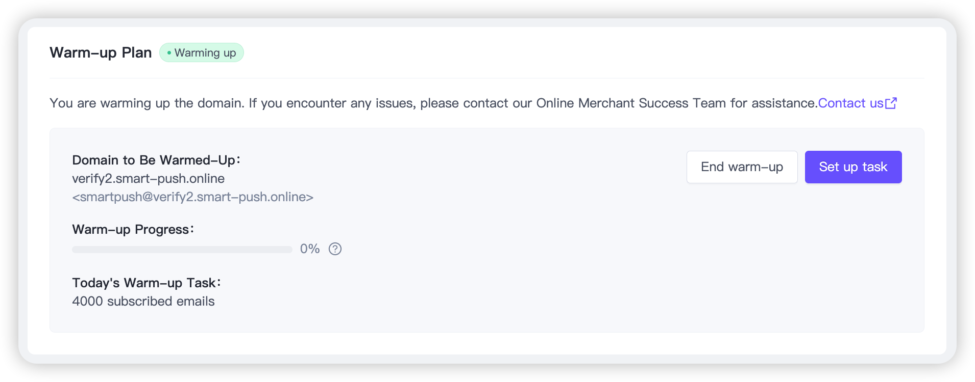 The warm-up status is updated in real time, showing a clear overview of the custom domain reputation and warm-up email open rate.