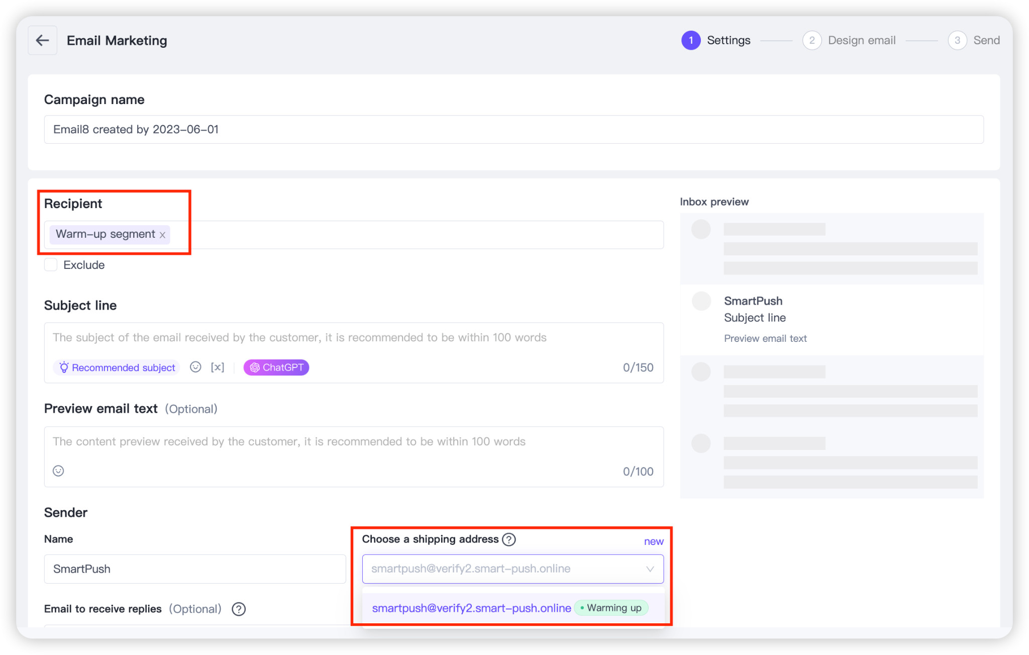Choose the segments and the custom domain to be warmed up when sending emails to complete the daily warm-up plan.