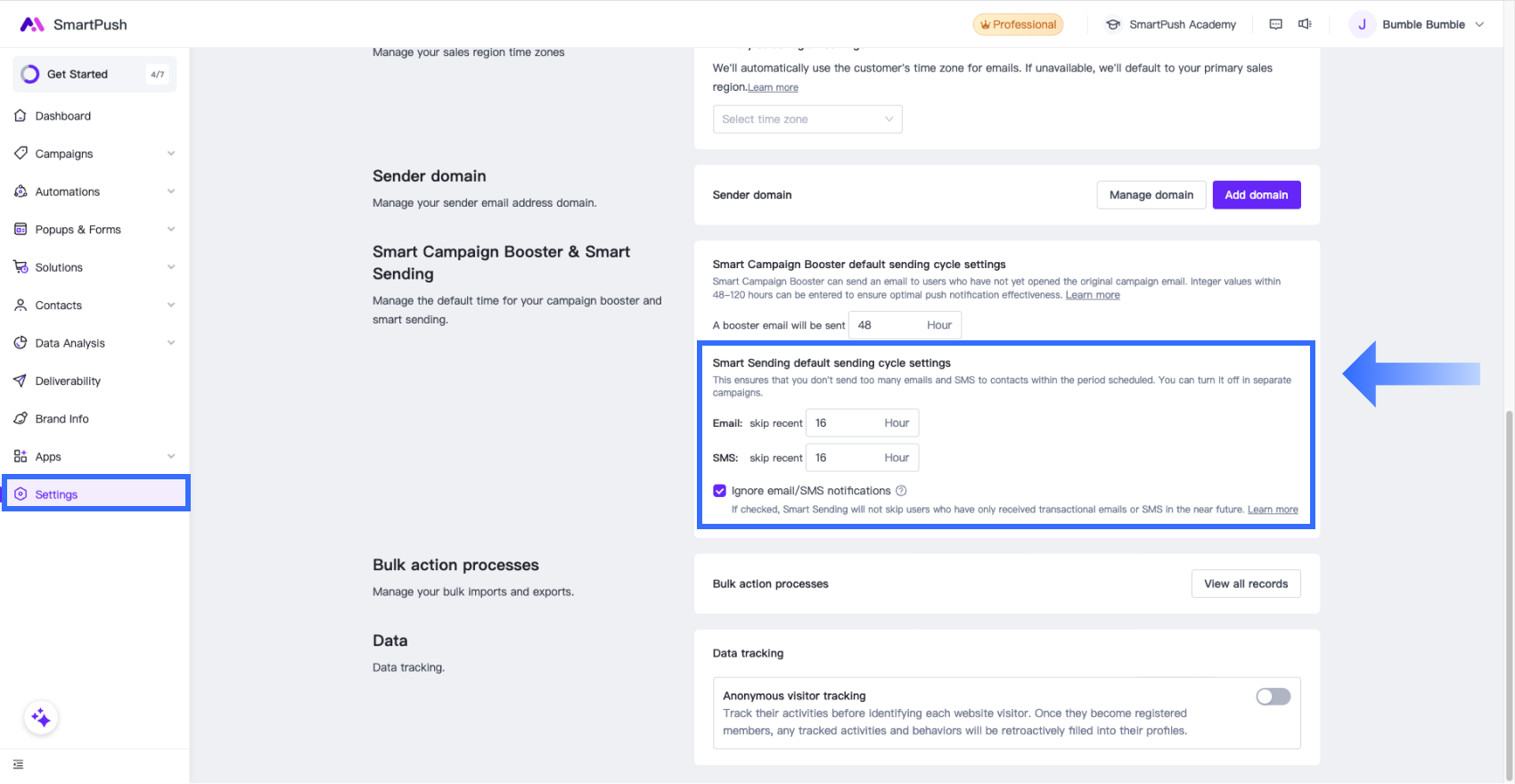 Go to Settings > Smart Campaign Booster & Smart Sending to define your default sending cycle. You can set separate cycles for email and SMS (1-120 hours). The recommended period is 16 hours.
