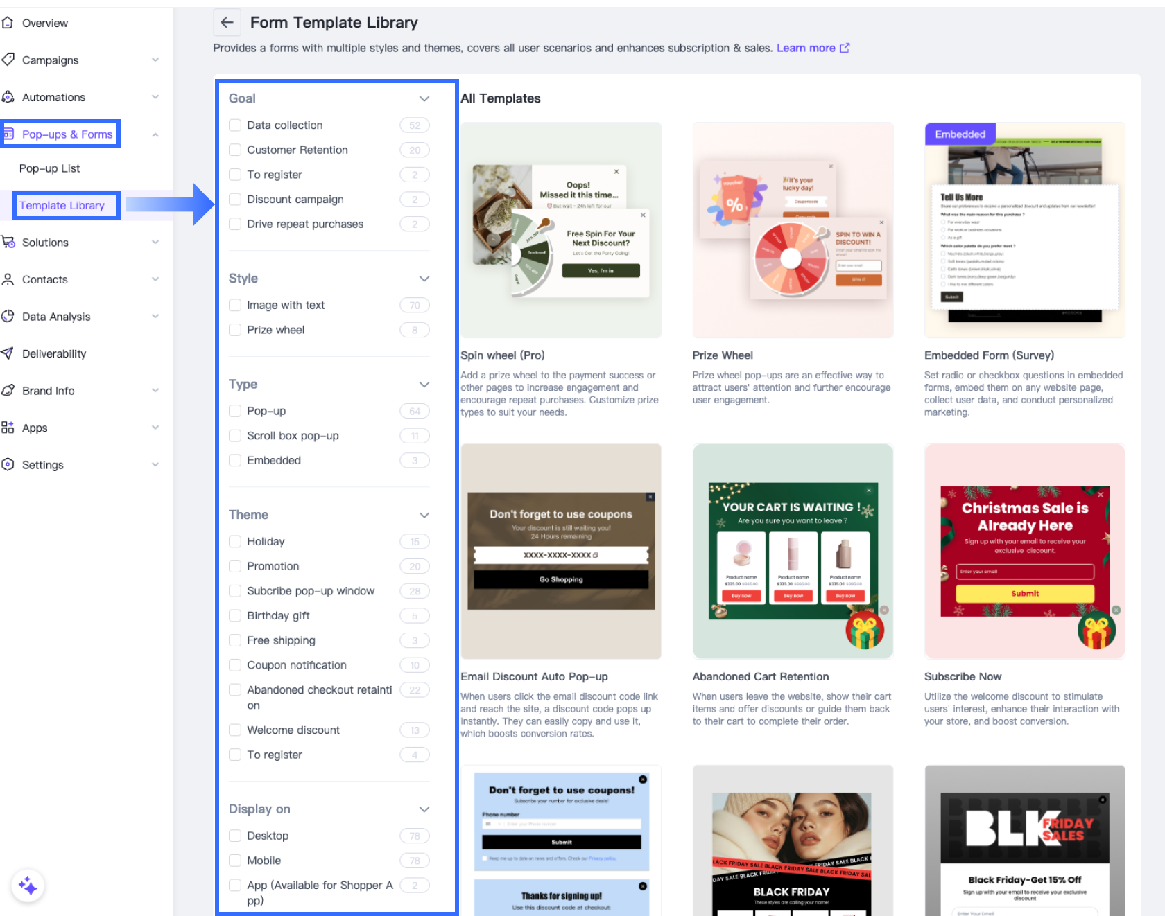To help you quickly find the right form for your marketing goals, SmartPush organizes templates by goal, style, type, and theme.