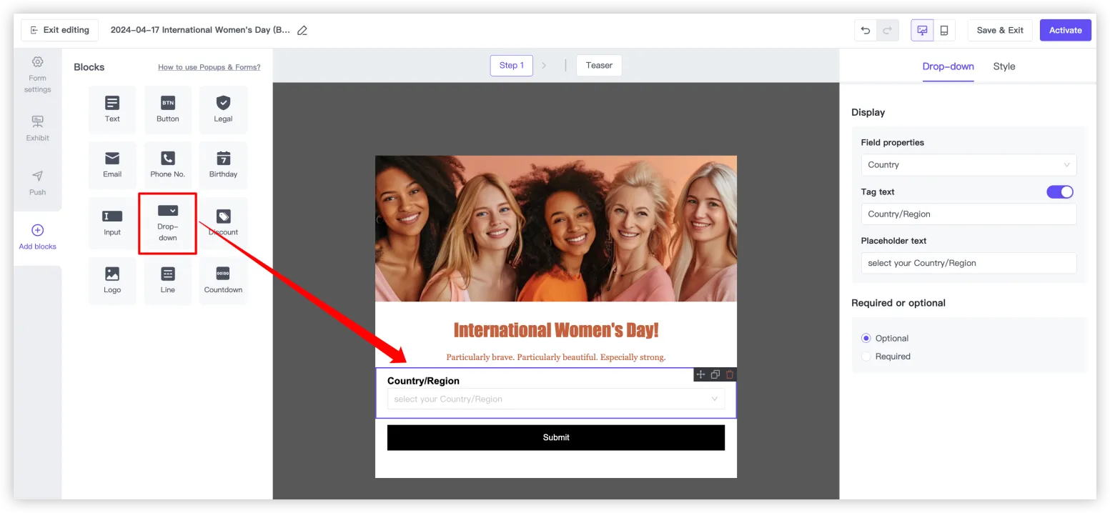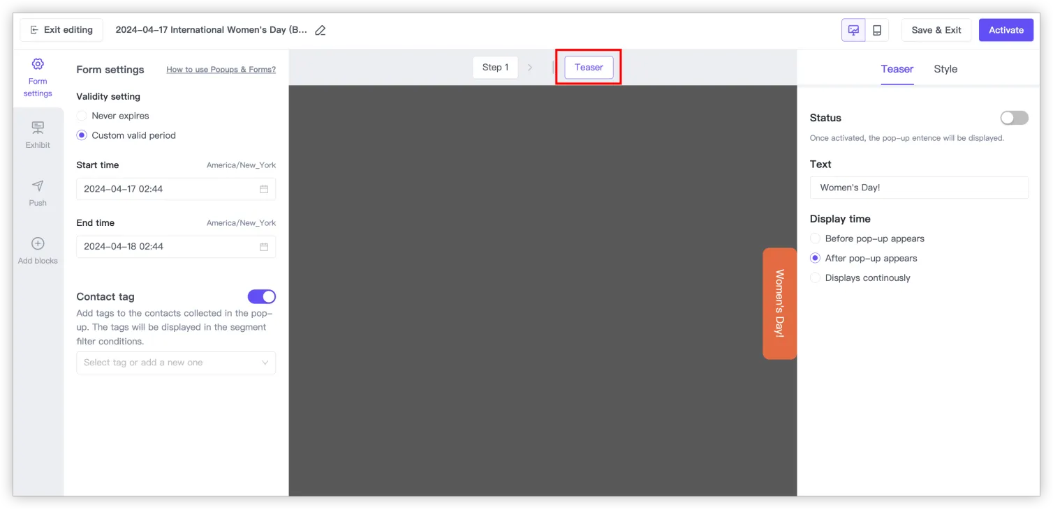 Upon completion, click Save & Exit to save the pop-up form or click Activate to publish.