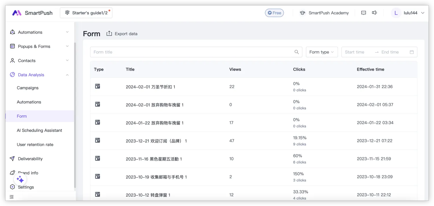 Go to [Data Analysis] > [Form] to export the complete performance data of the form. You can also view the individual performance of each form campaign.