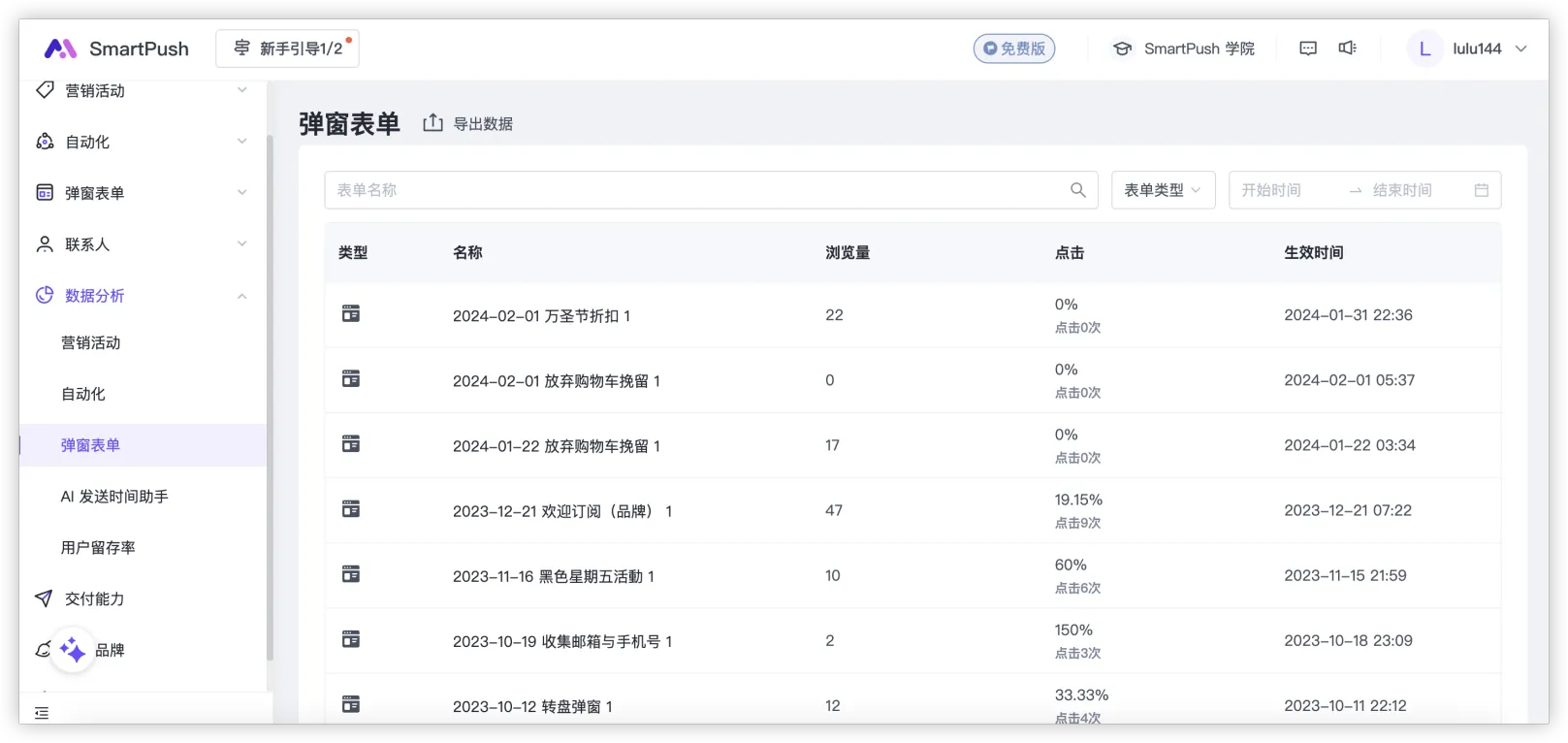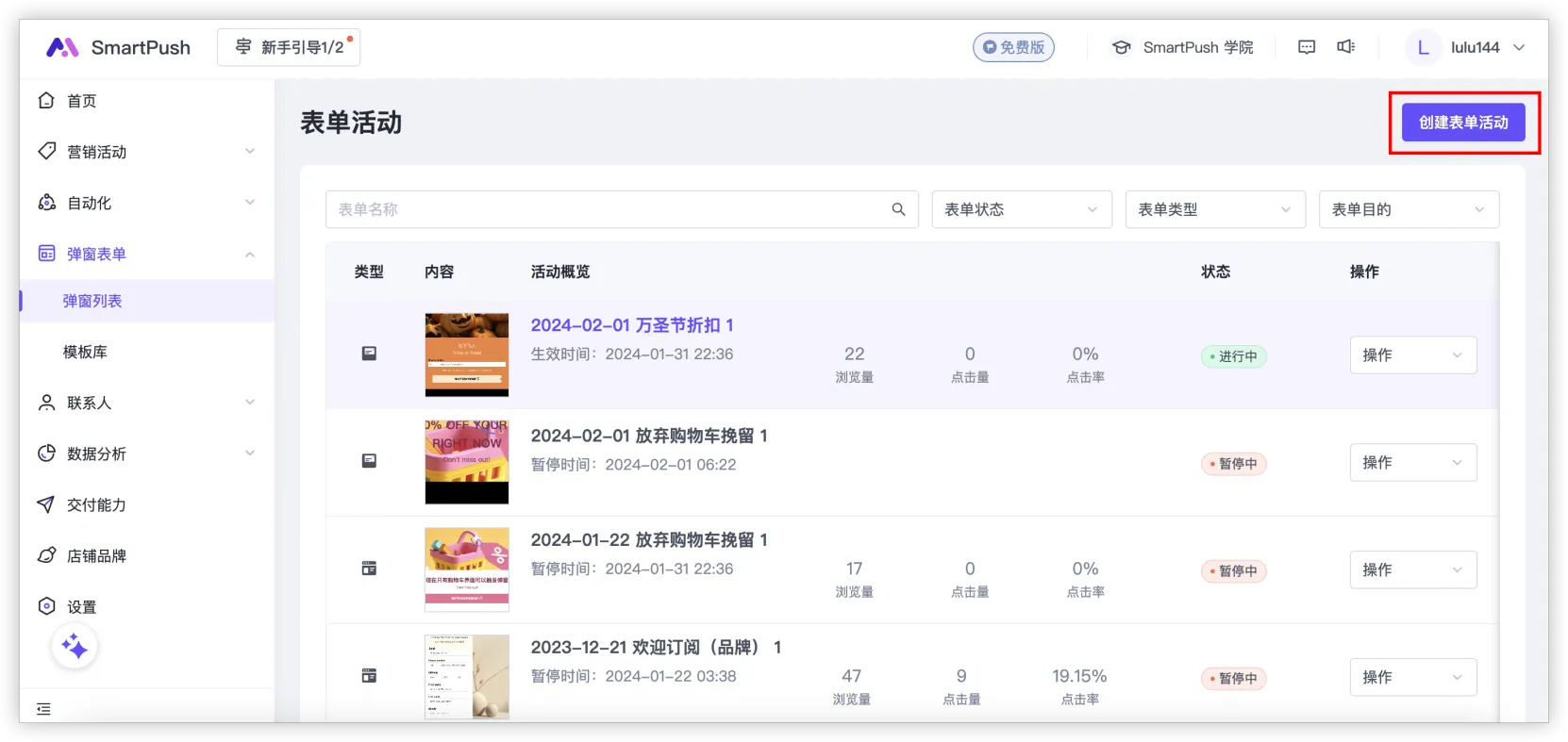 You can view your configured form campaigns by navigating to [Popups & Forms] > [Popup List]. In the campaign overview section, you can see metrics like views, clicks, and click rate. There are five indicators of the status field: Draft, Pending, Ongoing, Paused, and Finished. For the actions field, there are: