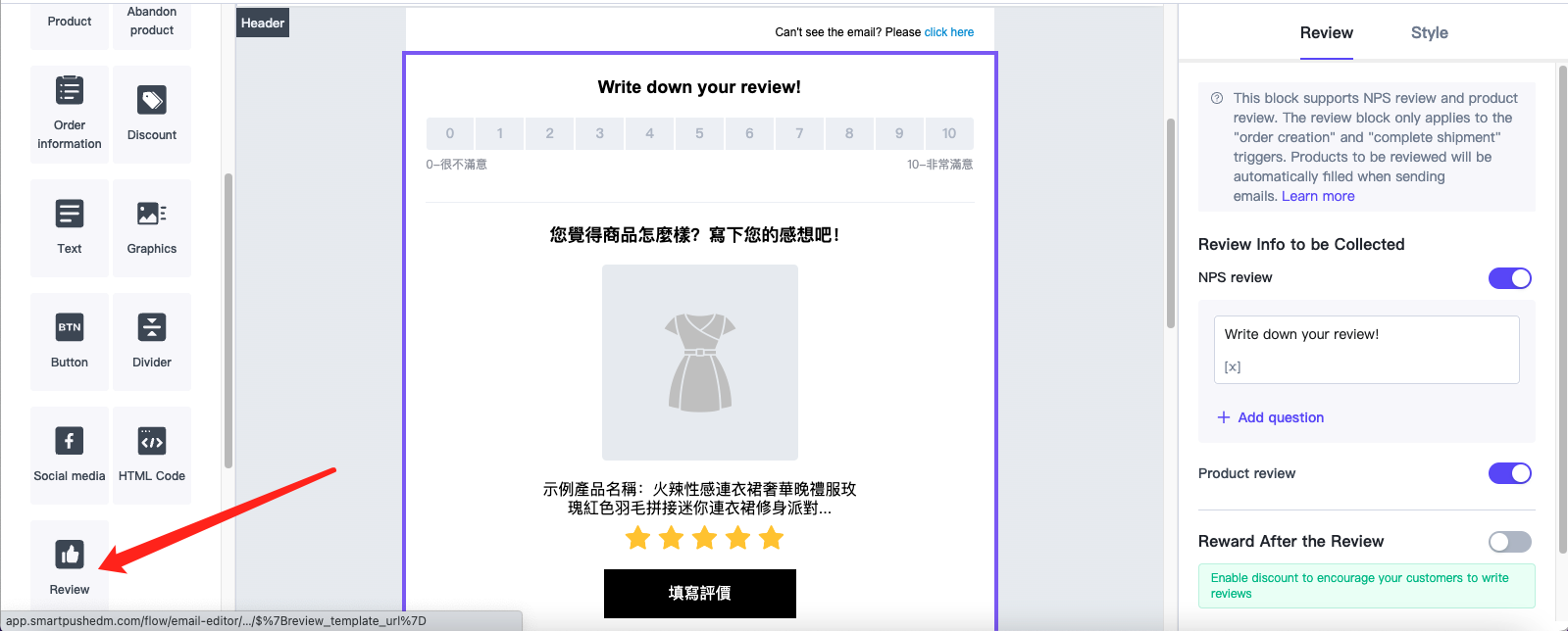 Please note that the Review block is only applicable to the email editor in the automated system process and needs to be activated by setting the trigger conditions to [Order creation] or [Order completion] in the automation task. Once the settings are completed, the system will automatically retrieve the product information from the order and fill it in. In case you have selected an incompatible trigger condition that causes the system to fail to retrieve the information, the Review block will be hidden when the email is sent.