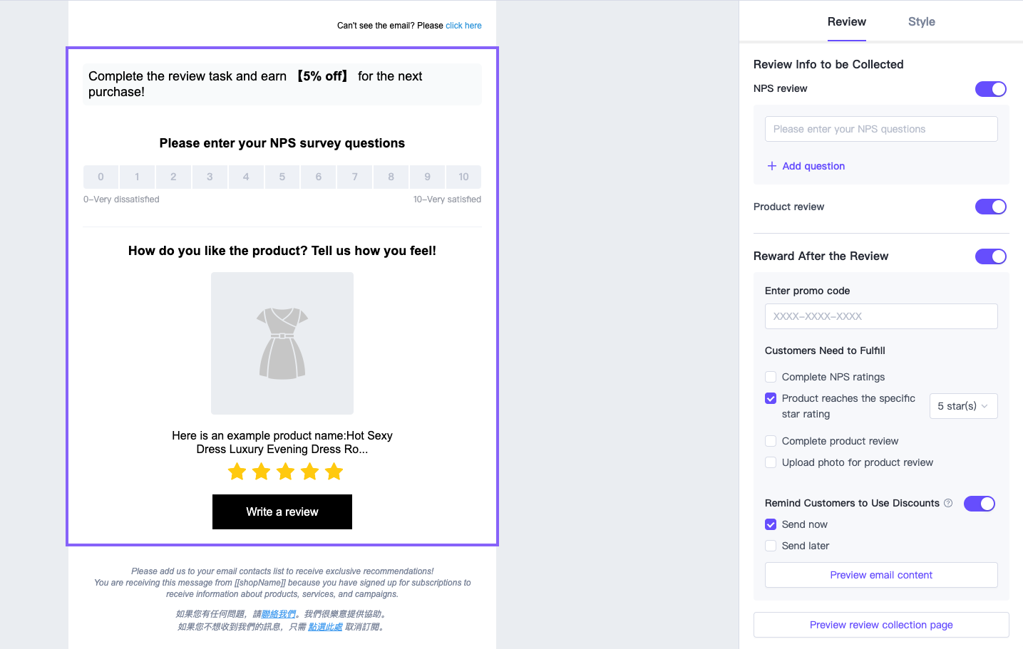 With the Review block, you can set up review rewards to encourage customers to leave reviews proactively. Also, you may turn on reminders to prompt customers to use discounts and place orders immediately, increasing your online store's conversion rate.