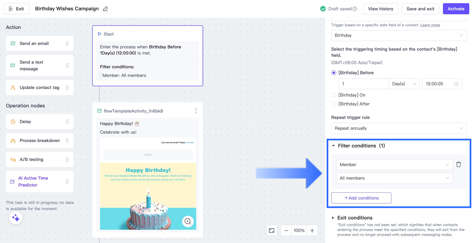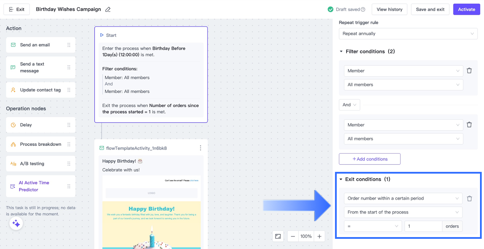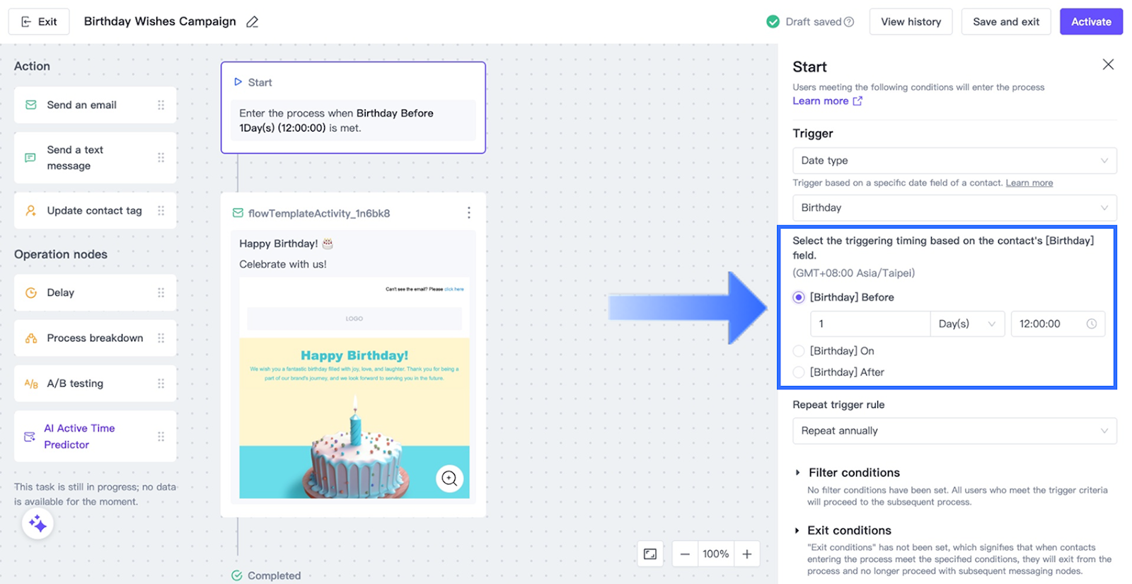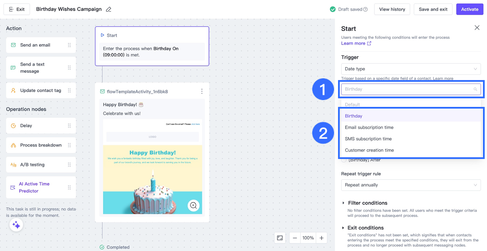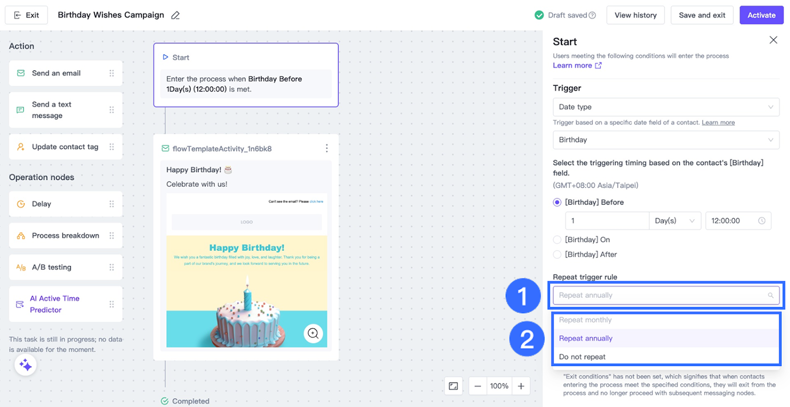 Tip: Annual repetition is commonly used for birthday campaigns.