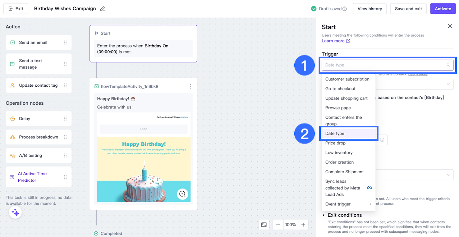 3. In the automation editor, select Date type as the Trigger.