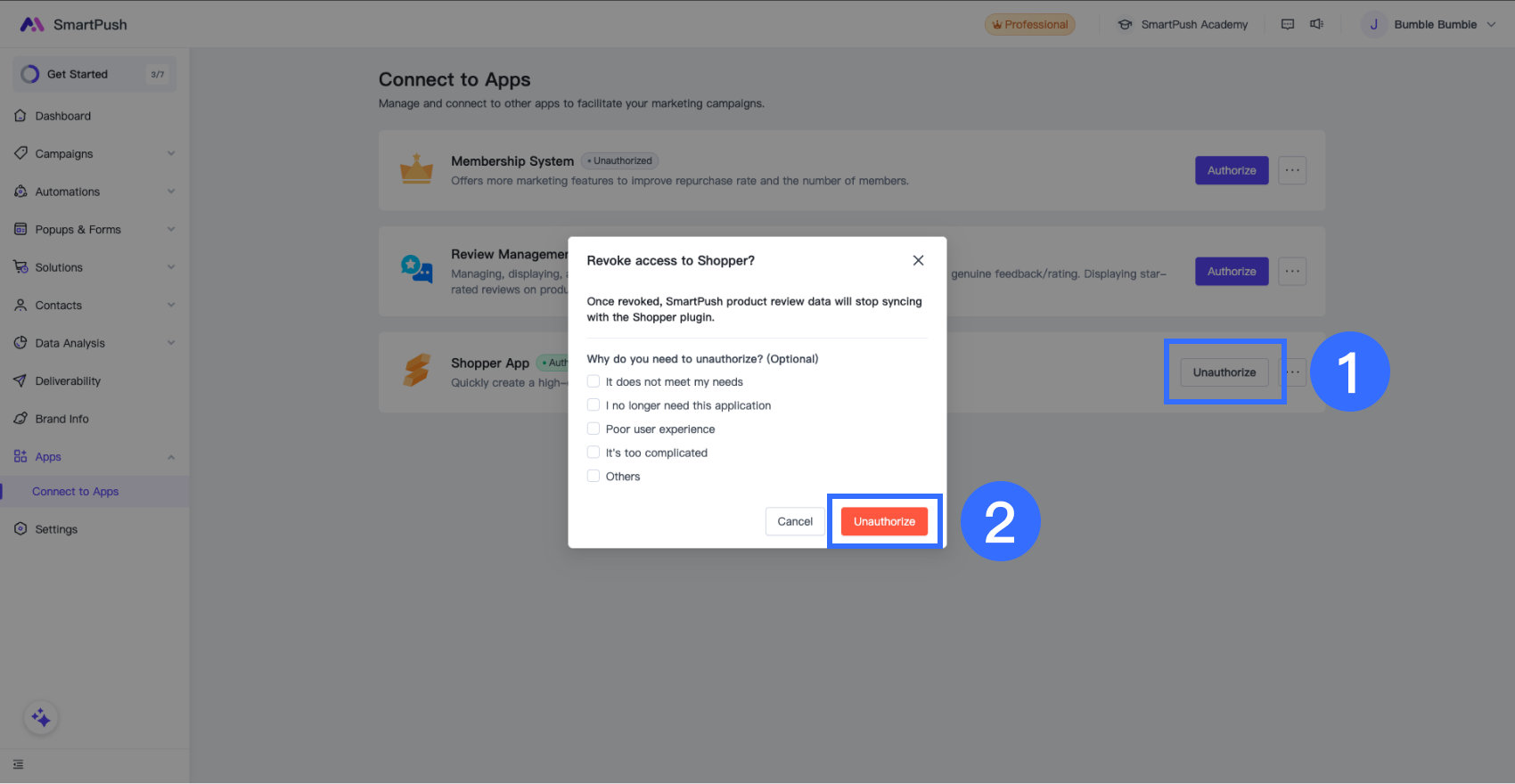 You can unauthorize the integration with Shopper App in SmartPush. Doing so will only stop SmartPush pop-ups from appearing in the app. It won’t uninstall Shopper App from your SHOPLINE admin panel, so you can still build and expand your mobile app.