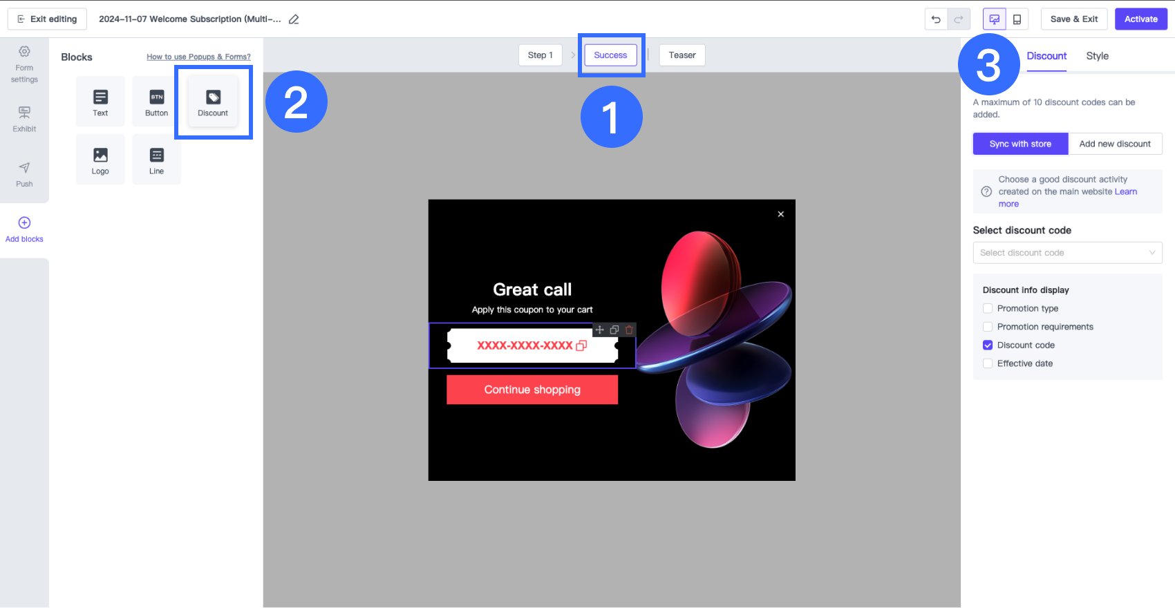 - The Discount component will be available at each step to you. Choose which discount details to display. The discount code isn’t allowed to display at the first step. You can choose discounts from your store, or create new ones by switching to Add new discount, where you can specify the type, effective time, and condition of the discount. Keep in mind that the discounts displayed on pop-ups should be the same before and after customers finish registration. Up to 10 discounts can be added.
