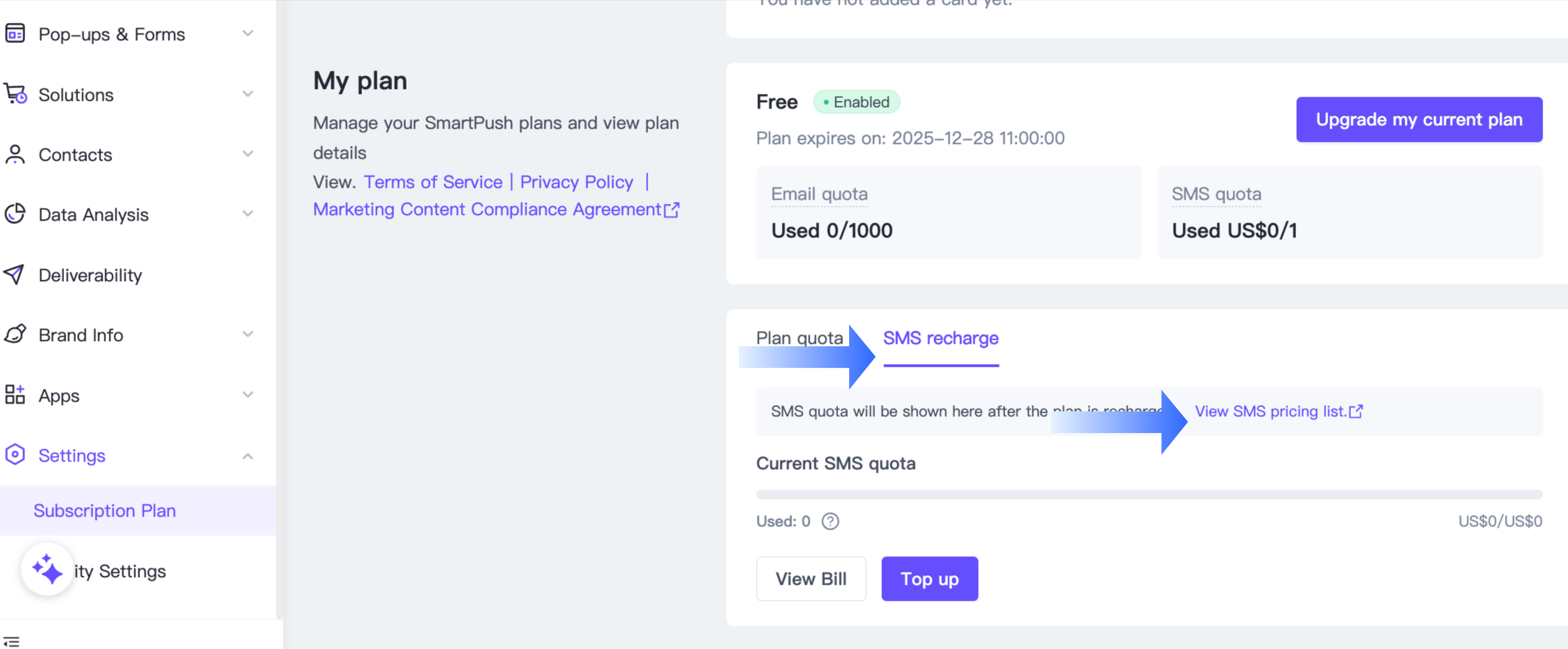 Go to SmartPush > Settings > Subscription Plan > My Plan.