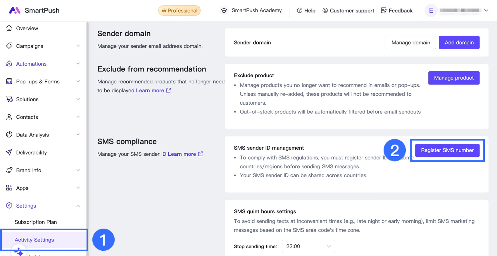 - In SmartPush, go to Settings > Activity Settings from the left navigation menu.