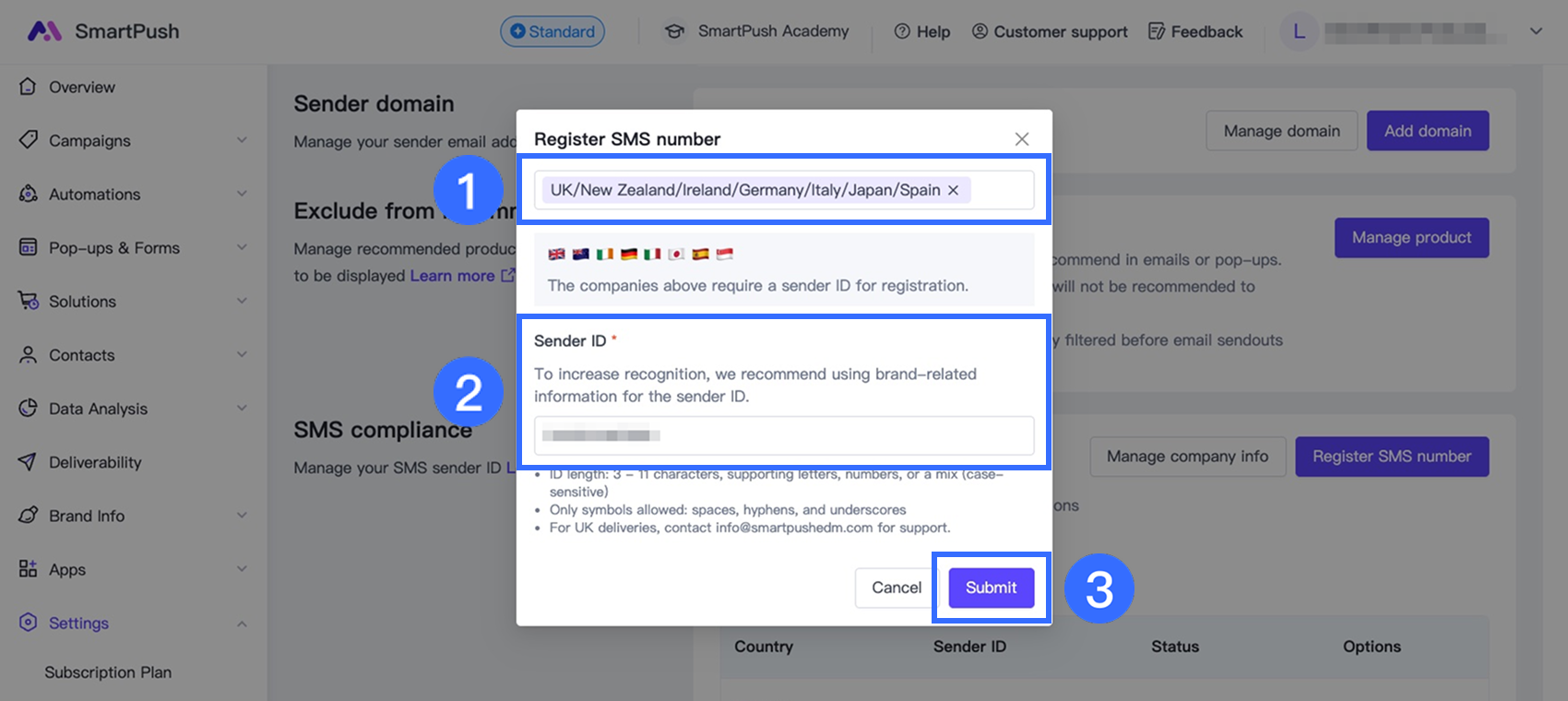 To meet these requirements, SmartPush requires merchants to apply for a sender number for certain countries or regions, depending on where their SMS recipients are located.