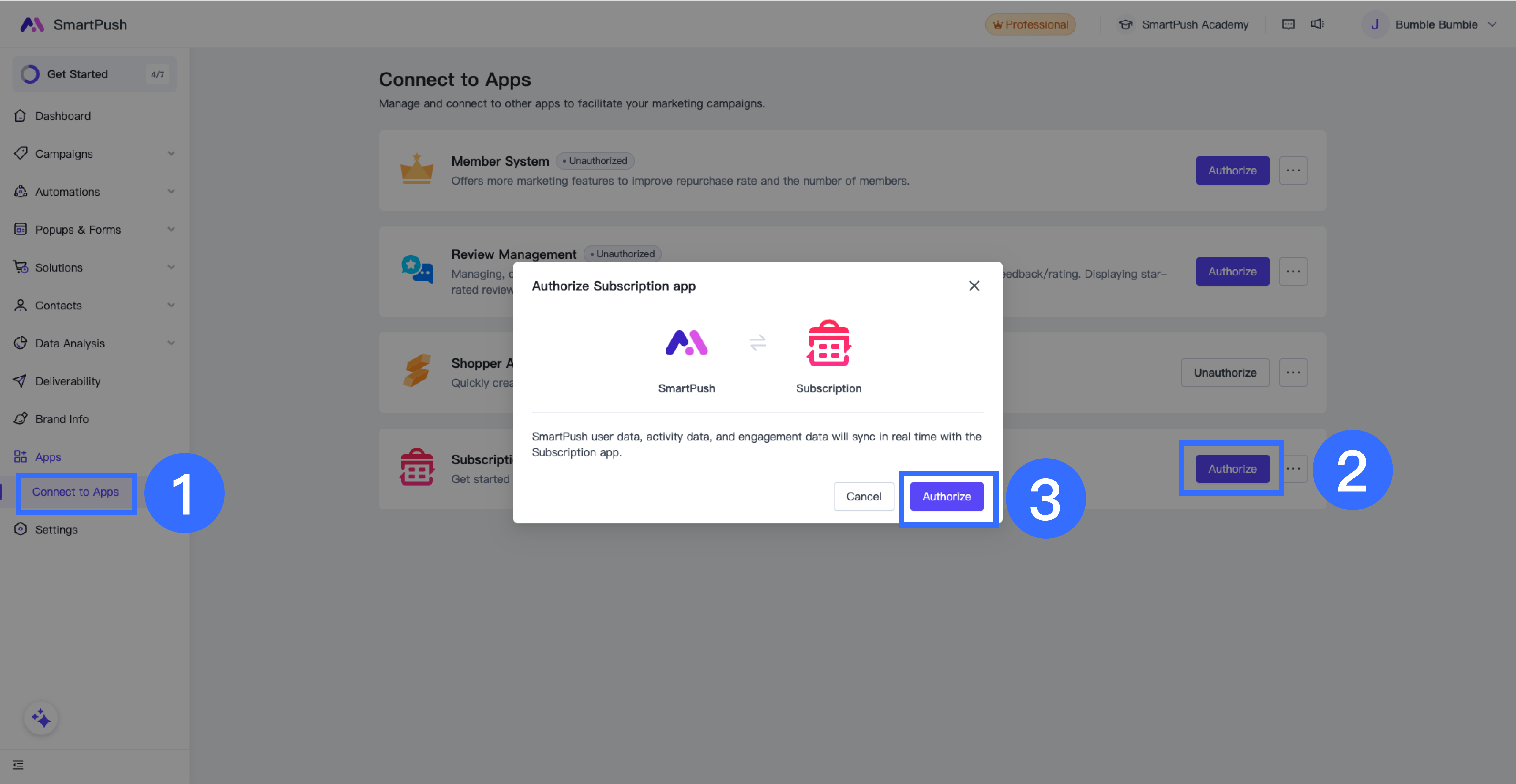 First, install the Subscription app from your SHOPLINE admin panel, then follow these steps to authorize it with SmartPush: