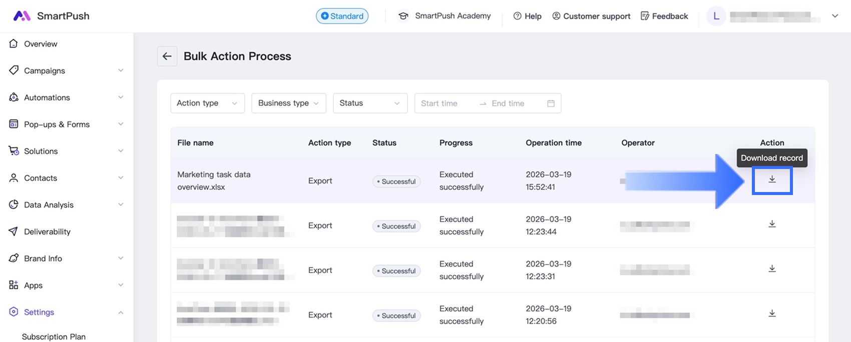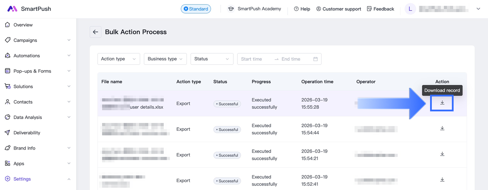 You can view campaign analytics directly in SmartPush or export reports for deeper analysis. Exported reports allow you to review campaign performance, track customer interactions, and share data with your team.