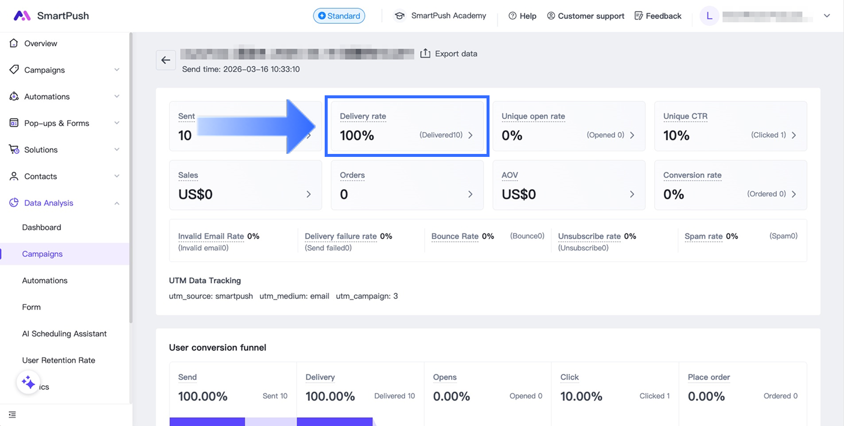 To view analytics for all marketing campaigns, go to Data Analysis > Campaigns in the SmartPush admin.