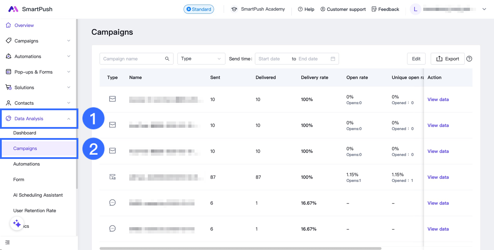 - Go to Data Analysis > Campaigns, then click View data for the campaign you want to analyze.