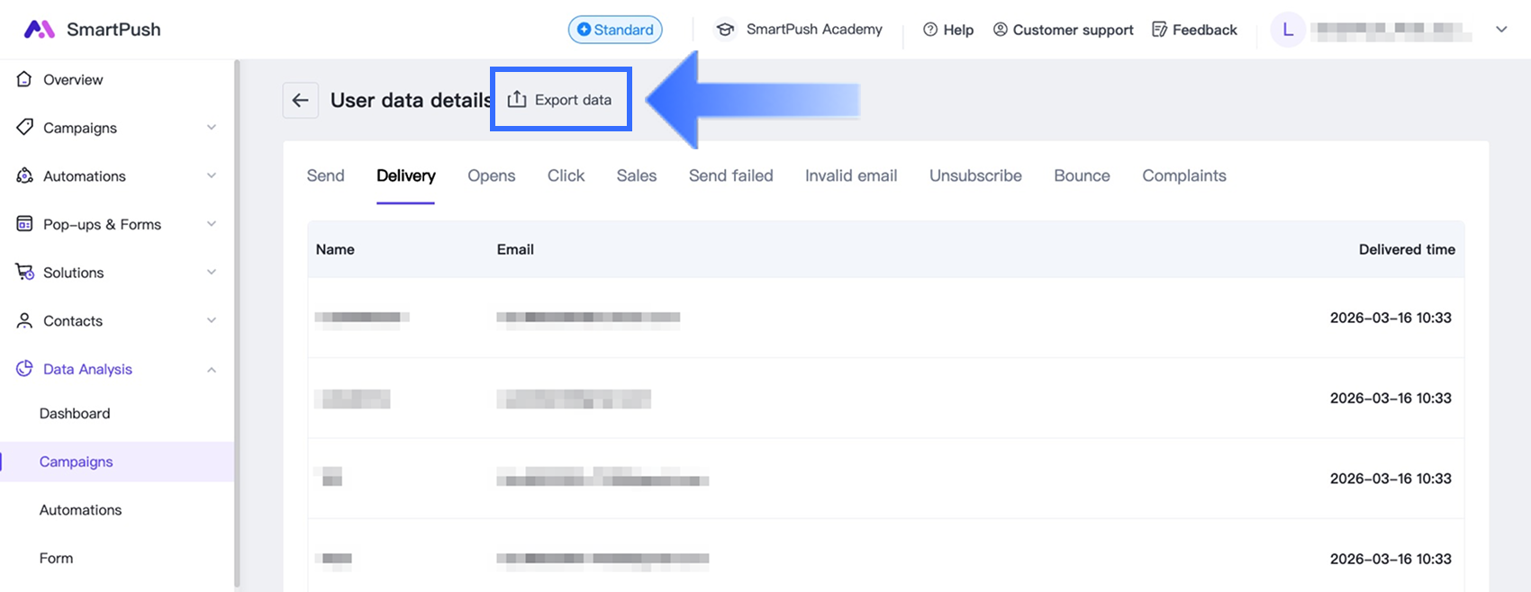 Go to Data Analysis > Campaigns, then click Export in the top-right corner .