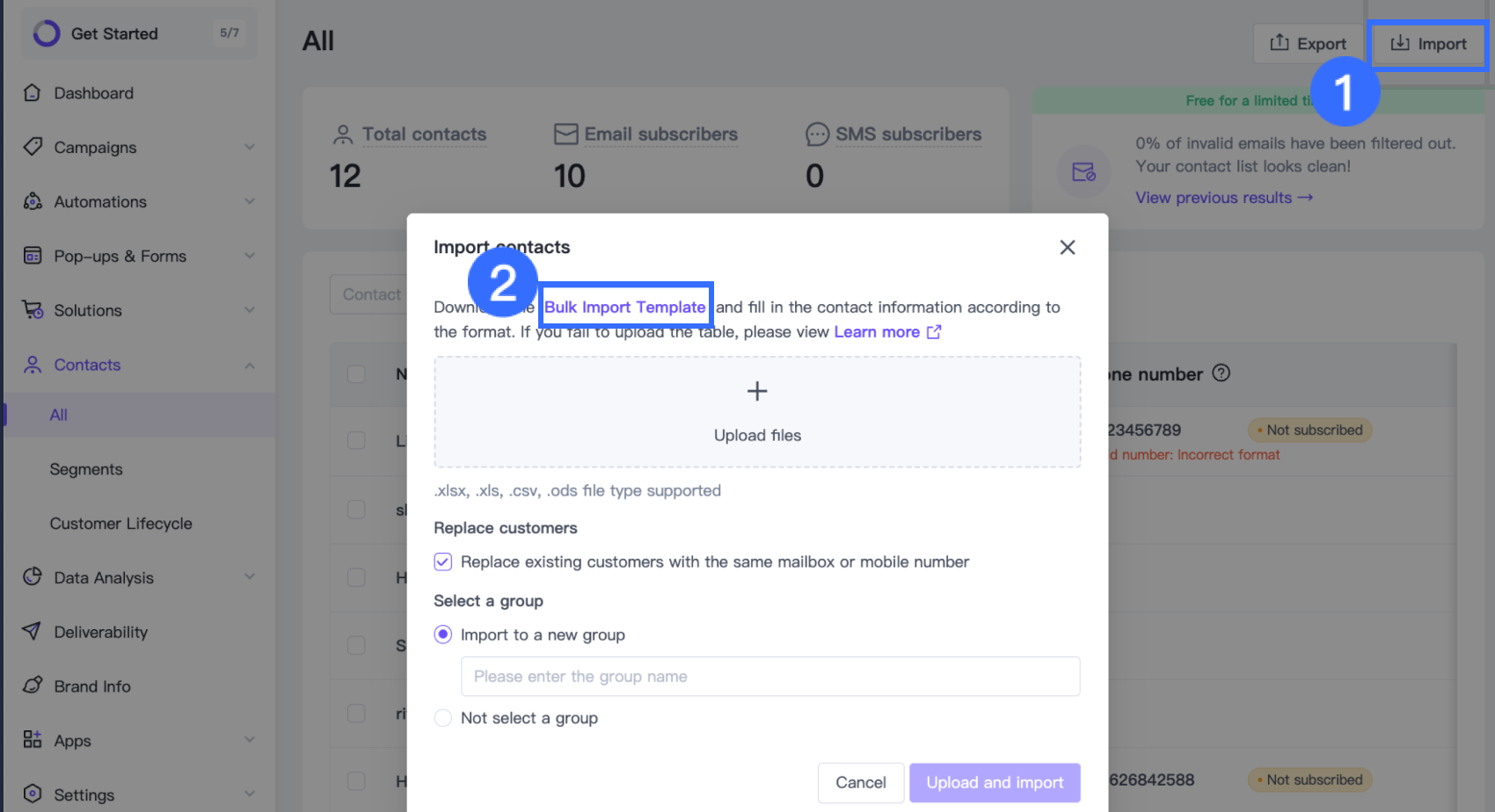 - In SmartPush, go to Contacts > All > Import and download the Bulk Import Template.