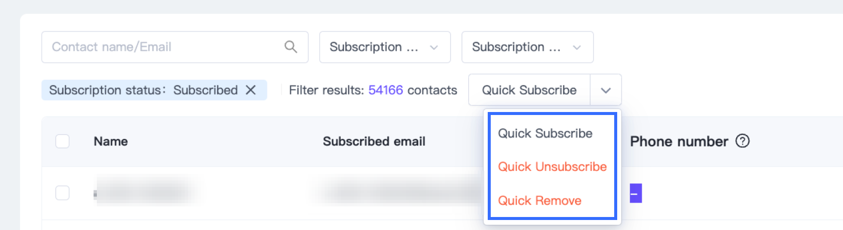 - Use One-click Subscribe, One-click Unsubscribe, or One-click Remove for all filtered contacts.