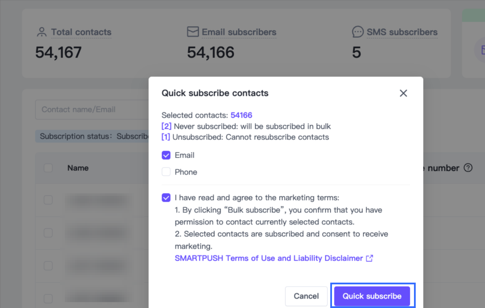 In SmartPush, go to Contacts > All, and filter contacts based on subscription status and channels (Email or SMS).