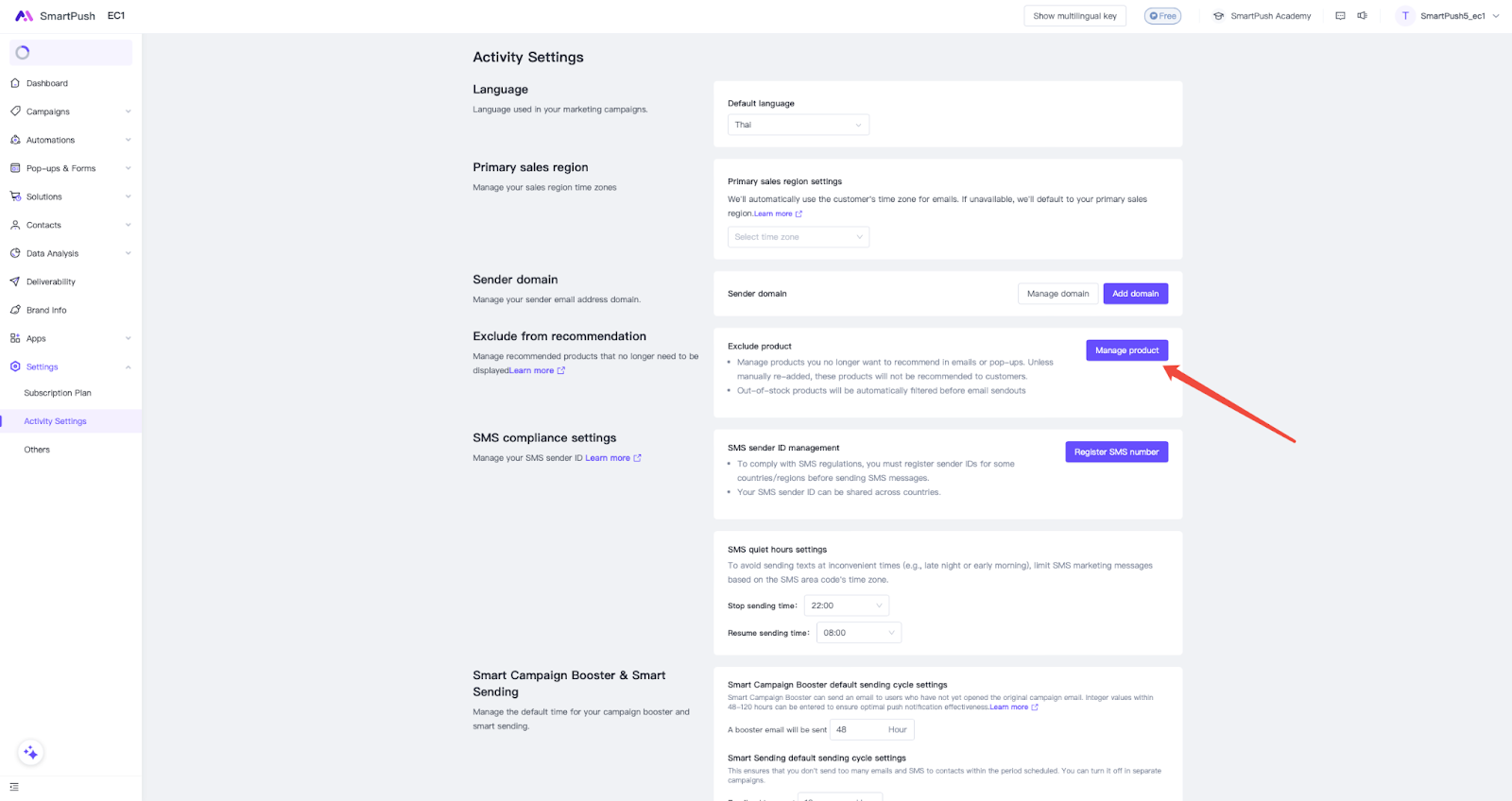 Go to SmartPush Sidebar → Settings → Activity Settings → Exclude from Recommendation → Manage Product