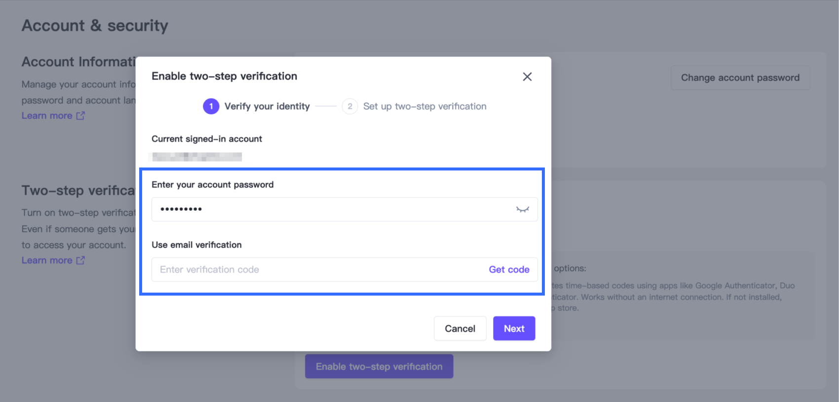 - Complete the second verification using your selected 2FA method.