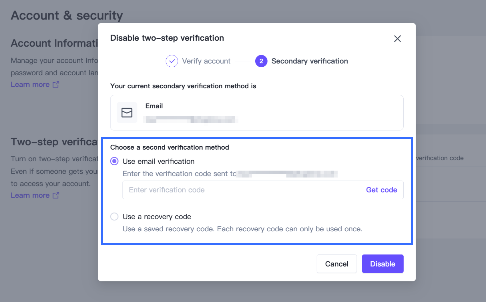 - When disabling 2FA, complete password verification.
