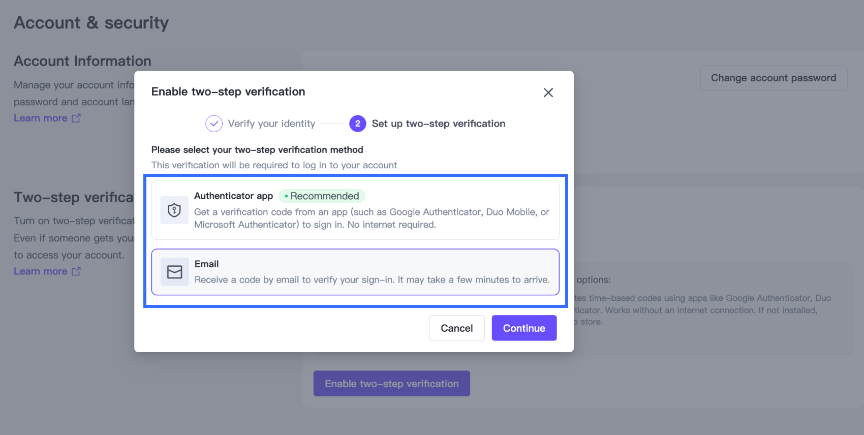 Go to Account Management > Account & security, then click Enable two-step verification.