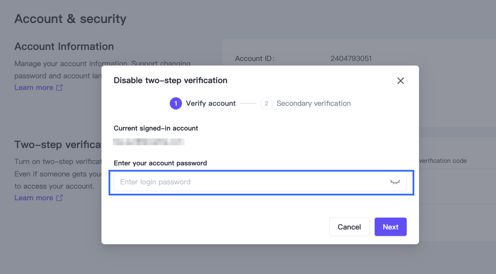 - Verify your current account password (based on risk control rules).