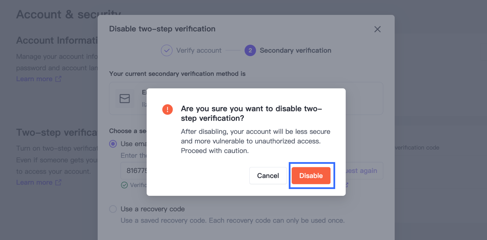 In the pop-up window, click Disable to confirm disabling 2FA.