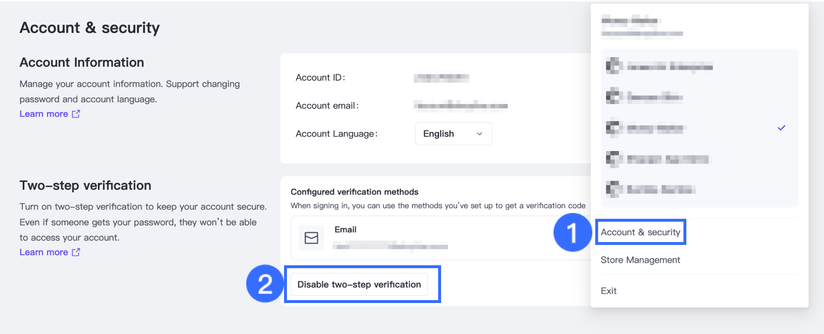 Go to Account Management > Account & security, then click Disable two-step verification.
