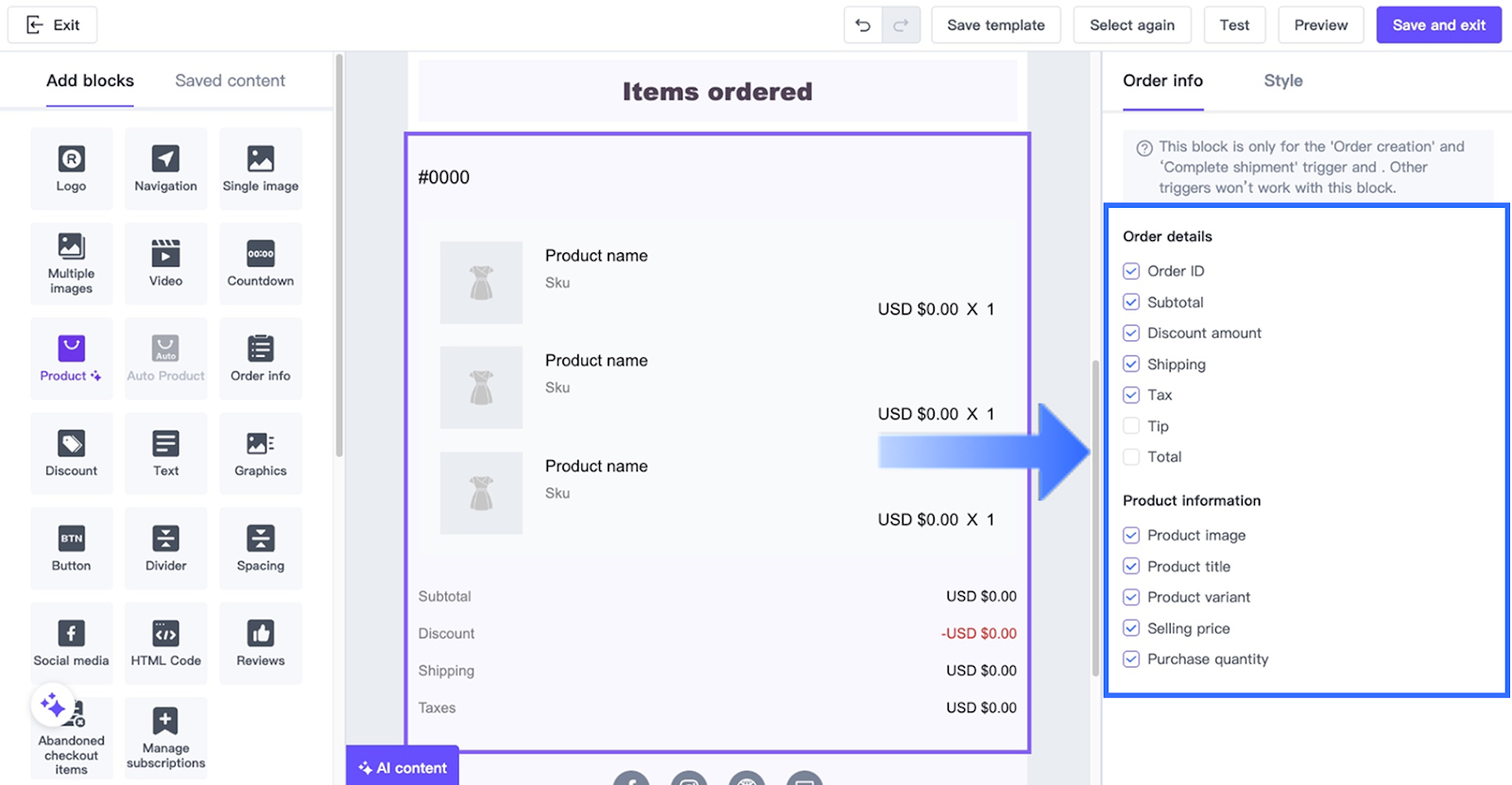 | Note: This block can only be used in automation workflows triggered by Order creation. If it is used with other types of triggers, the system will not be able to retrieve the correct order data, which may result in missing or empty content in the email. |