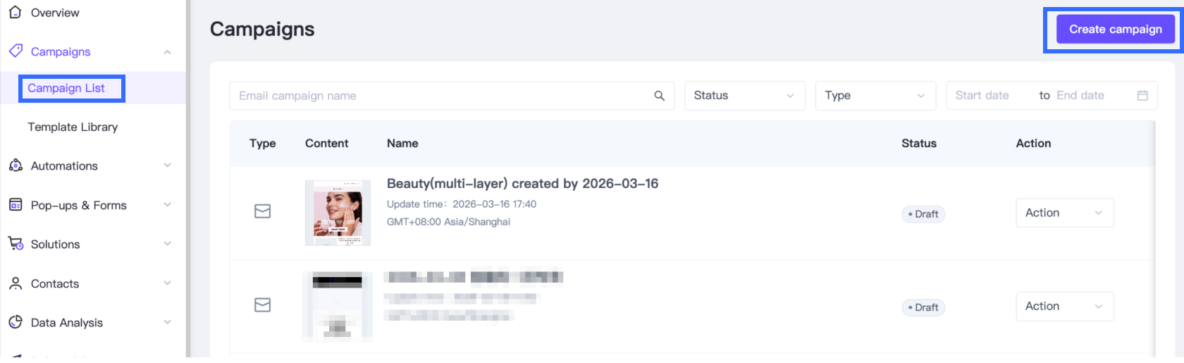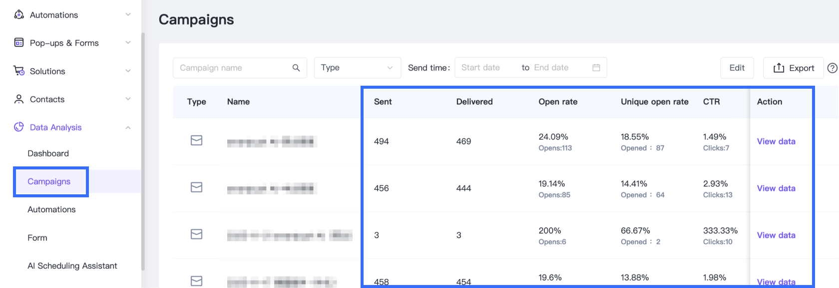 After the campaign is sent, you can track performance data in Data Analysis > Campaigns, including opens, clicks, and delivery metrics.