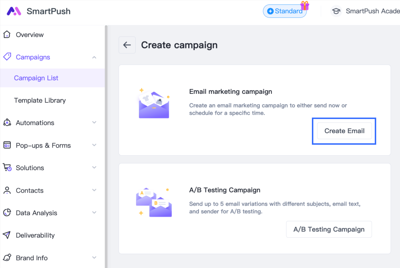 In the SmartPush Admin, go to Campaigns > Campaign List, then click Create Campaign.