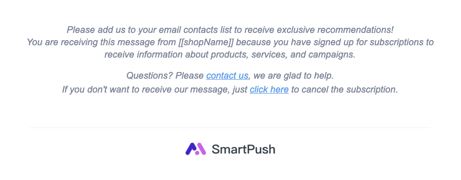 - Due to compliance requirements, marketing emails must include links for customers to unsubscribe from emails and contact information, typically placed in the email footer. SmartPush defaults to a pre-set footer template, but also allows you to customize the text and presentation of your email footer.