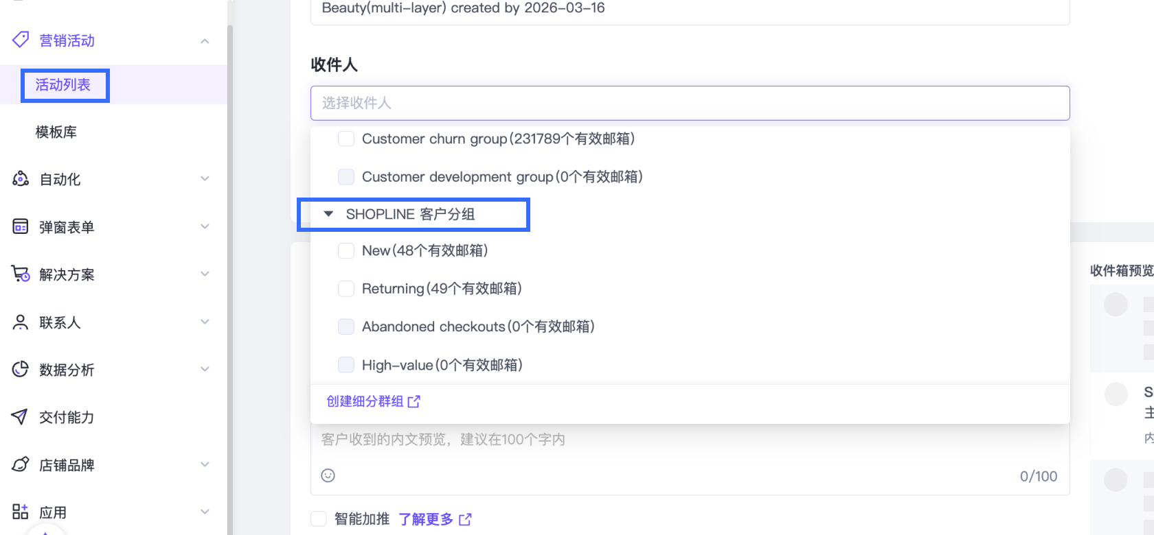 邮件/短信营销活动,收件人下拉框,新增 SHOPLINE客户分组 ,勾选主站客户分组进行营销