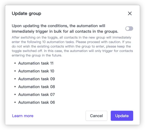 - 同时您也可以通过开关选择,更新条件后是否要针对群组内所有的联系人立即批量触发该群组所关联的、处于启动状态的自动化任务。