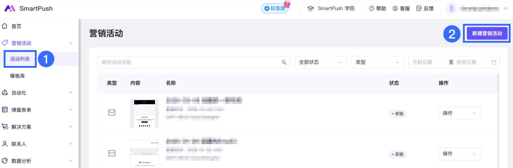 - 在 SmartPush 后台,前往 营销活动 > 活动列表。