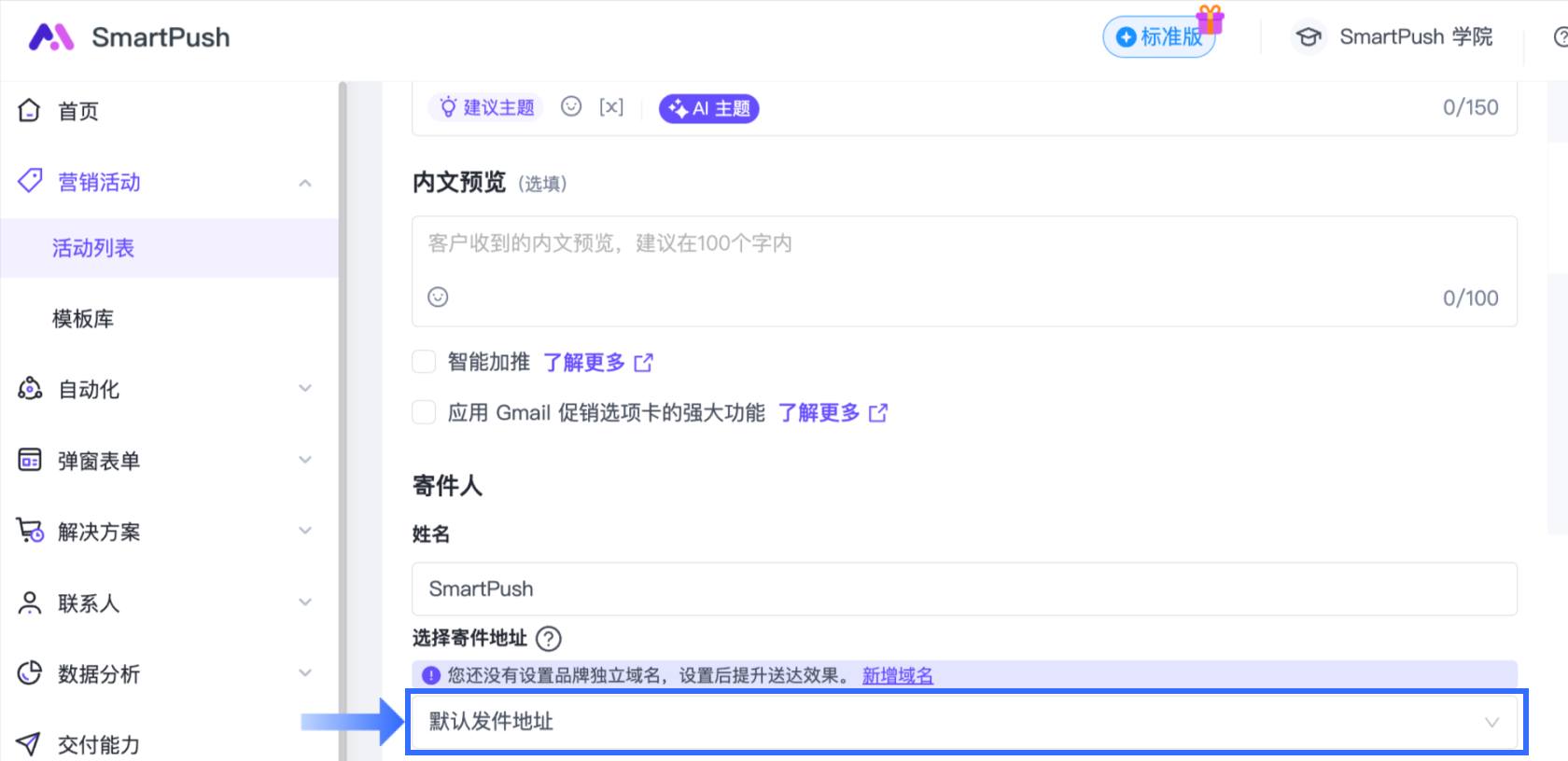 系统默认寄件地址为 SmartPush 商家共用,寄件邮箱中包含 SmartPush 相关标识。该方式适合希望快速发送营销邮件,或尚未设置自定义域名的商家。