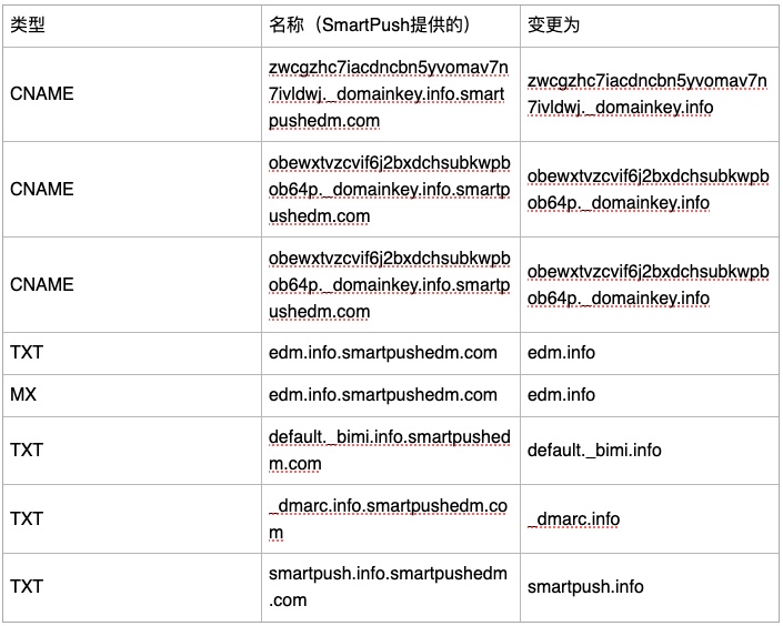 当您添加记录时,SmartPush给您提供的是左列的内容,您需要自行删除名称列中的主域名smartpushedm.com ,添加右列的内容到您的DNS后台。