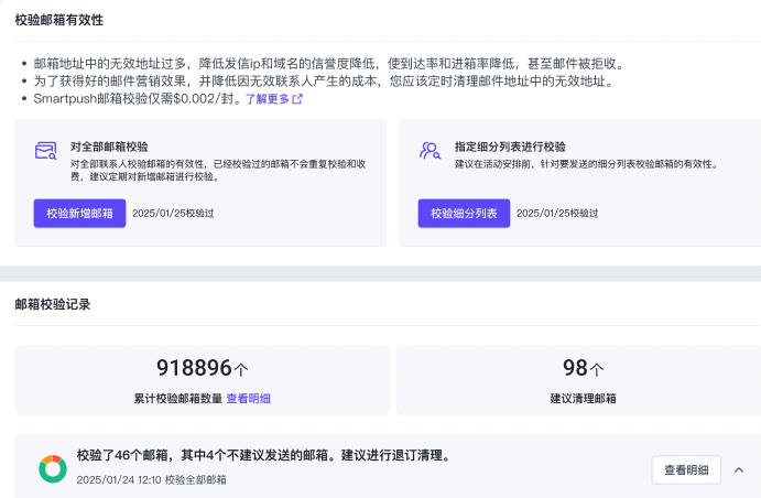 向无效或风险邮箱地址发送营销邮件可能会影响你的发件人声誉,甚至导致投递失败。通过 SmartPush 提供的邮箱验证功能,你可以: