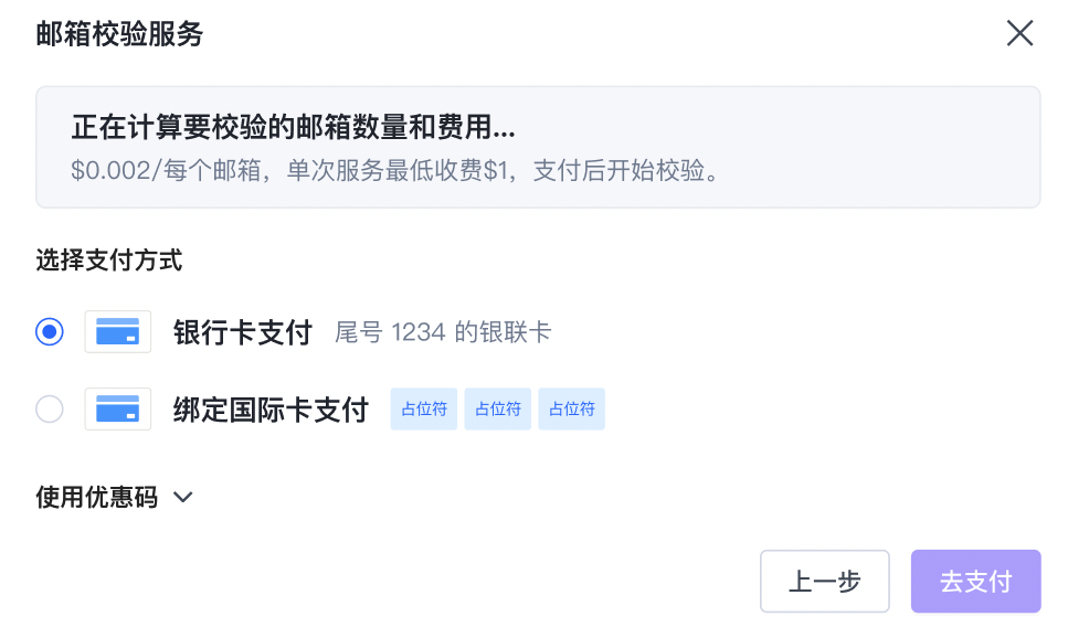 - 选择后,系统会计算金额,完成支付后立即开始校验任务