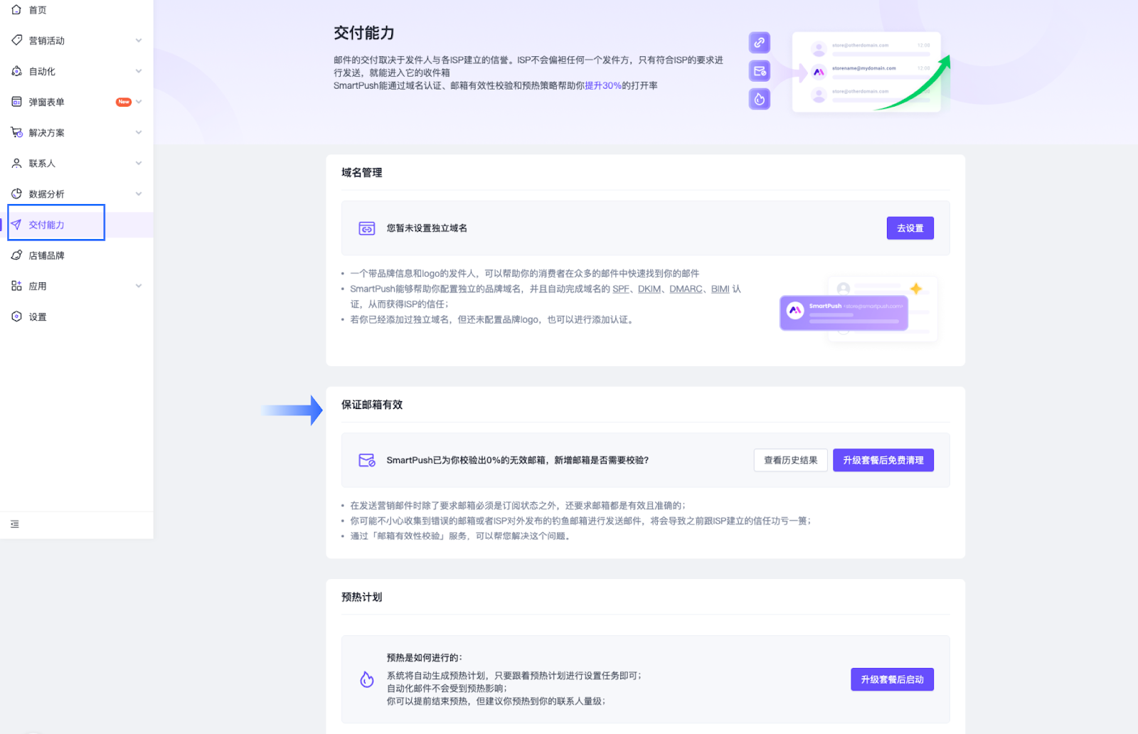 - 点击 SmartPush 左侧功能列表【交付能力】>【保证邮箱有效】